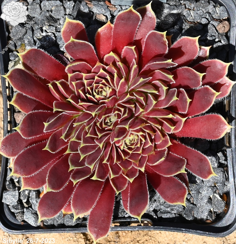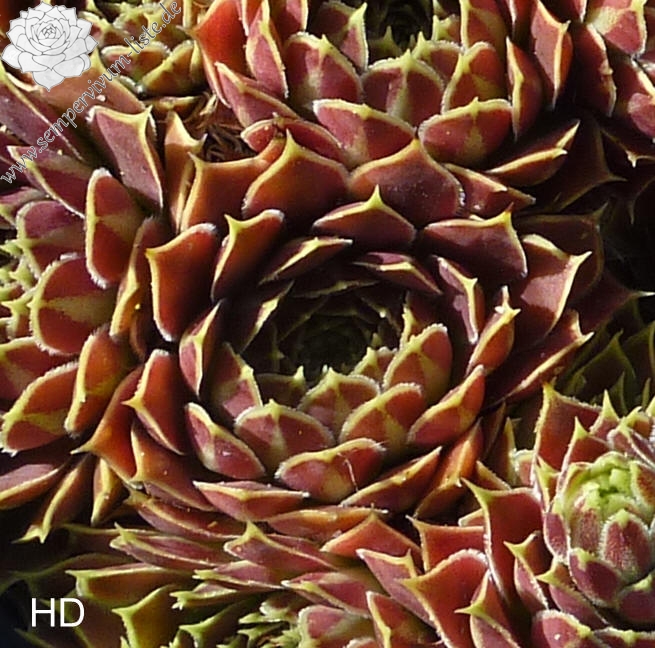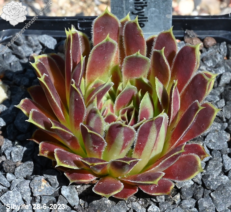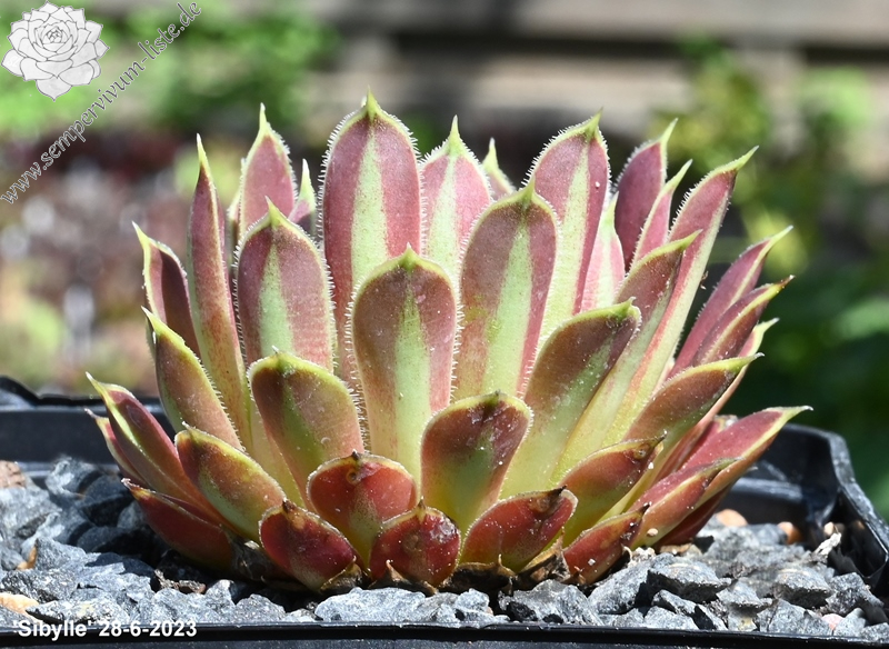 Rosetten 5 cm, Blätter oval, lang bespitzt, rotbraun, Blattränder gelb