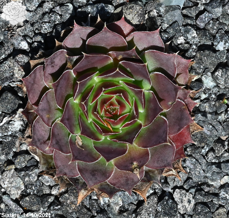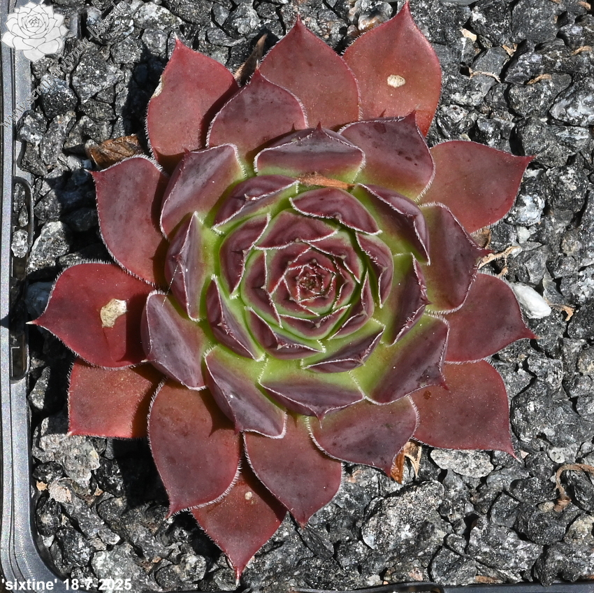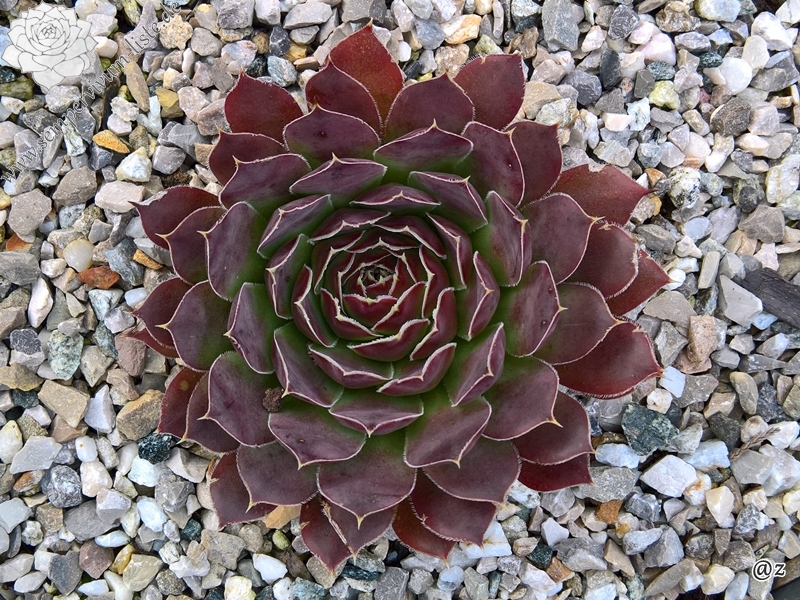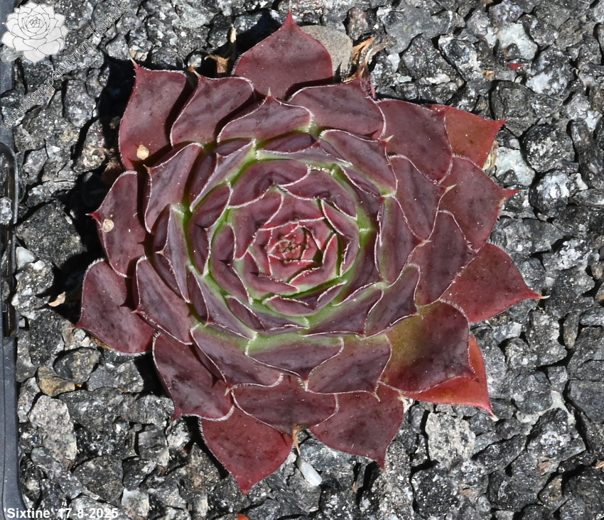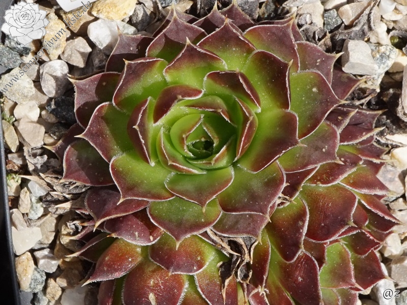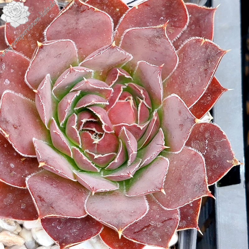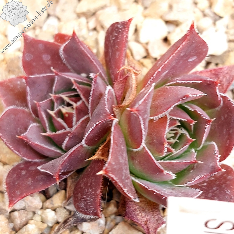 Rosetten bis 5 cm, Blätter kurz lanzettlich, lang bespitzt, bordeauxviolett, Blattränder bewimpert