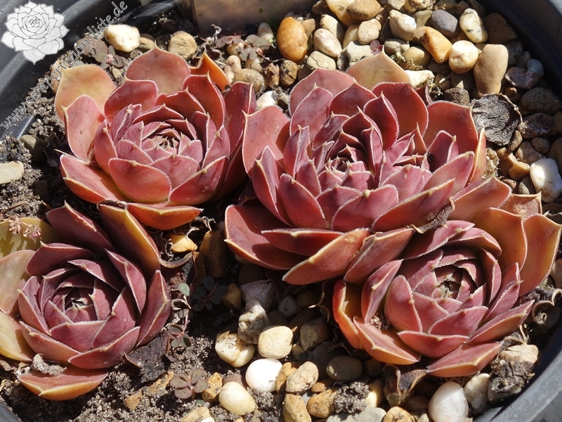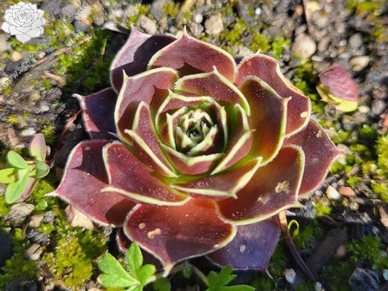 Rosetten bis 8 cm, Blätter breit rundlich, kurz bespitzt, signalviolett, Blattränder hell, bewimpert