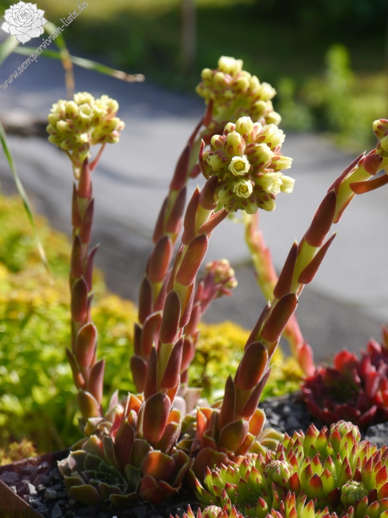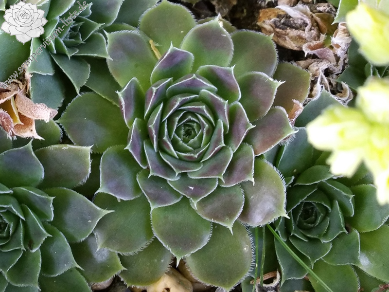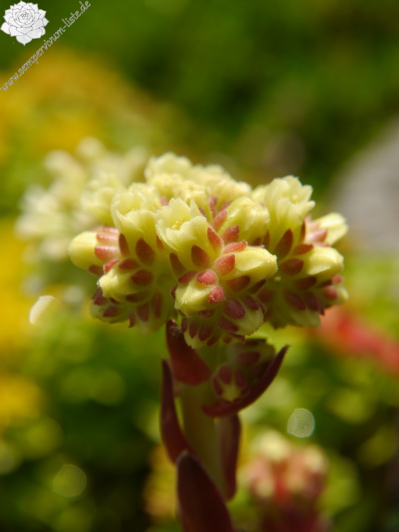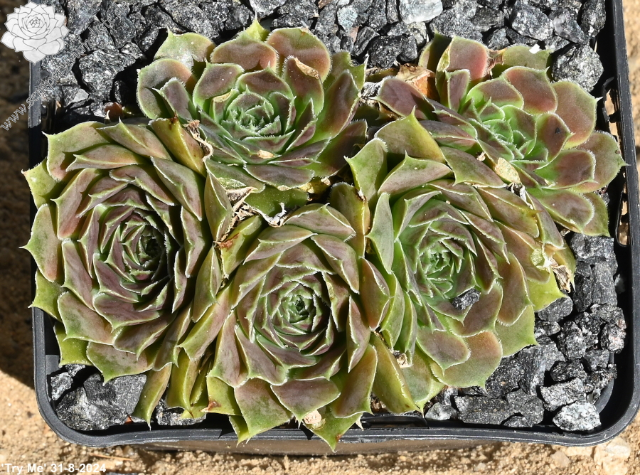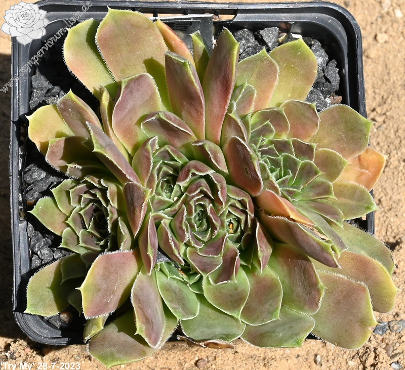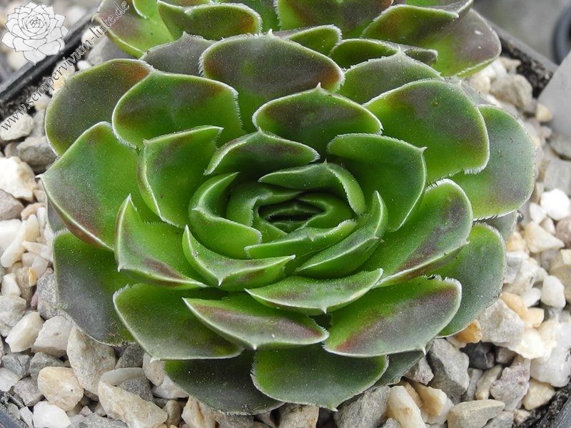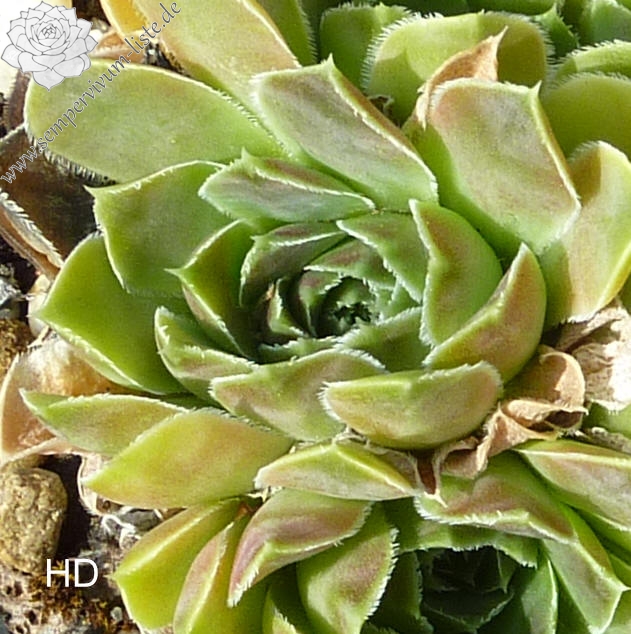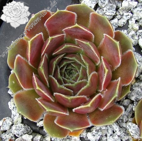 große Rosetten, Blätter oval, lang bespitzt, gelb - grün mit rosa, Ränder leicht bewimpert