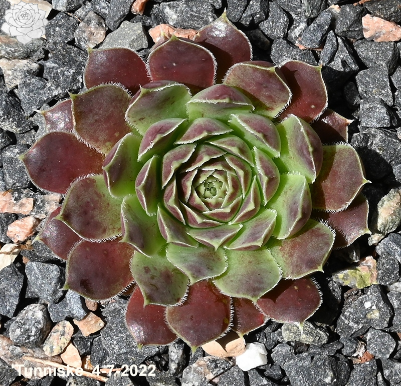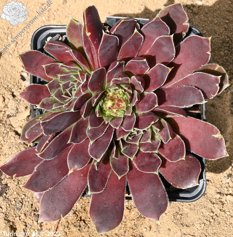 Rosetten bis 5 cm, Blätter lanzettlich, lang bespitzt, rotlila - signalviolett, Basis weissgrün, Blattränder grünlich, bewimpert