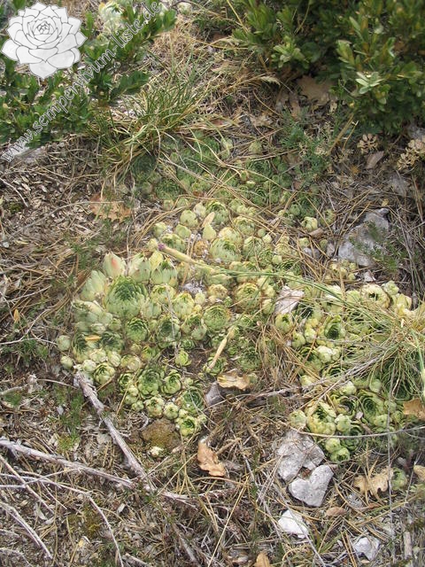 Die Semps-Rosetten waren stark geschlossen, denn immerhin hatten wir selbst hier oben 32 bis 36 Grad Celsius, und es hatte schon lange nicht mehr geregnet. Es war eine Augenweide, immer wieder kompakte Vorkommen zwischen den Buchs-, Rosmarin- und Lavendelsträuchern zu entdecken. Besonders schön harmonierten die Rosetten mit dem grauen, gelbblühenden Sedum sediforme.