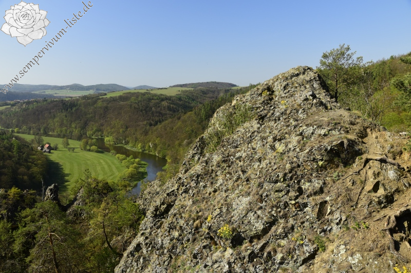 In diesem Reisebericht besuchen wir das Tal des Flußes Berounka in der Gegend um das Städtchen Křivoklát. Der Fluß Berounka hat in dieser Gegend ein besonders tiefes und enges Tal gebildet, es gibt zahlreiche Felsen an den Abhängen dieses Tales über beiden Ufer des Flußes. Čertova skála (skála = der Felsen auf Deutsch) liegt in der Nähe des Ortes Hracholusky, etwa 12 Kilometer südsüdöstlich von der Stadt Rakovník. Der Felsen Čertova skála befindet sich über dem linken Ufer des Flußes Berounka und ist besonders mächtig, der Boden des Tales liegt um etwa 150 Meter bis 200 Meter niedriger als die oberen Ränder des Tales. Der Felsen ist auch besonders steil, die Felswänden sinken steil unten in das Tal. Oben an den Rändern des Felsens habe ich Jovibarba globifera an einem schönen Naturstandort beobachtet.