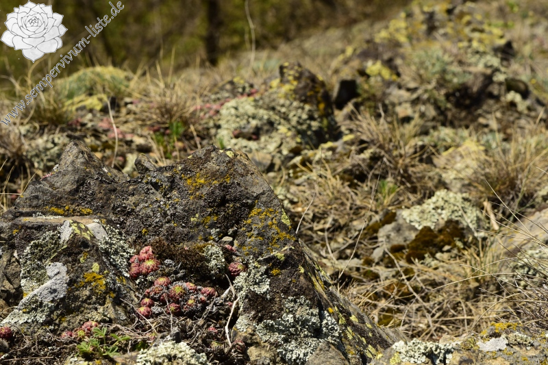 An dem Naturstandort habe ich eine riesengroße Menge der Rosetten aller Größen beobachtet. Leider nur wenige Rosetten sind zugänglich, viele Rosetten wachsen direkt an den steilen Felswänden und diese Felswänden sind ohne Kletterausrüstung unzugänglich. Die Rosetten wachsen am Naturstandort direkt an den Felswänden, in den Felsspalten und auch an den Rändern der Felsen. Die Rosetten an den Rändern der Felsen wachsen oft unter den Ästen der Sträucher, die Rosetten an den Felsenwänden wachsen höchstens mit den Gräsern, oft selbstständig.