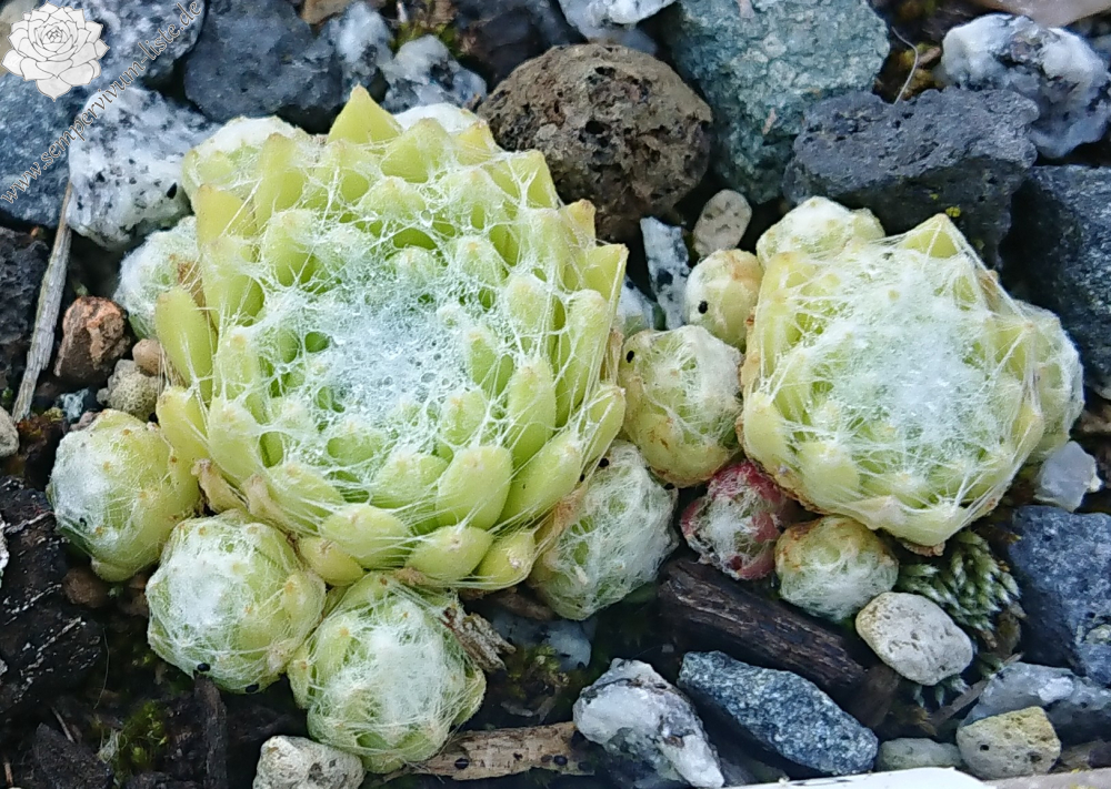 Sempervivum Albion ist einer der wenigen weiß blühenden Sempervivum-arachnoideum-Typen, dieser hier zeigt die größten Blüten. In manchen Jahren blüht er jedoch so reich, dass er keine richtigen Polster bilden kann!