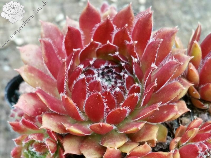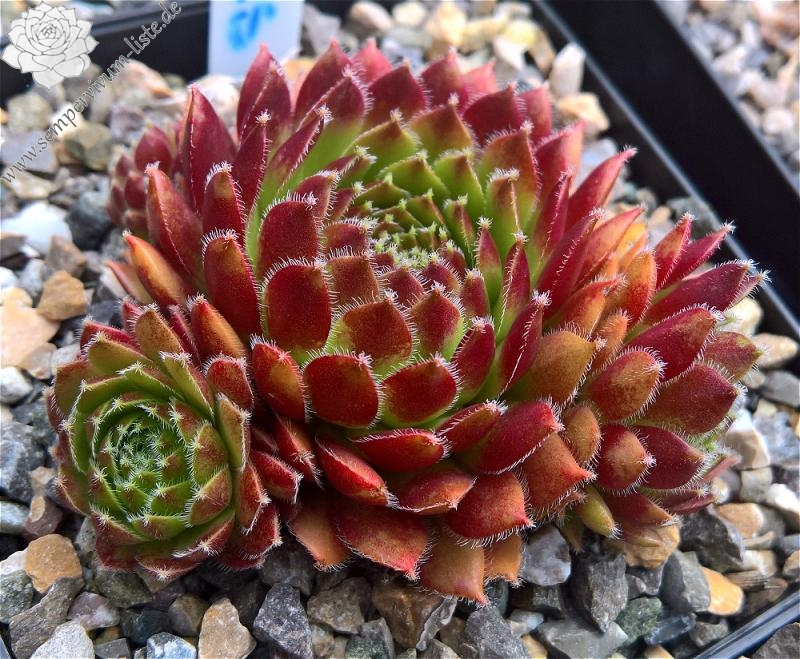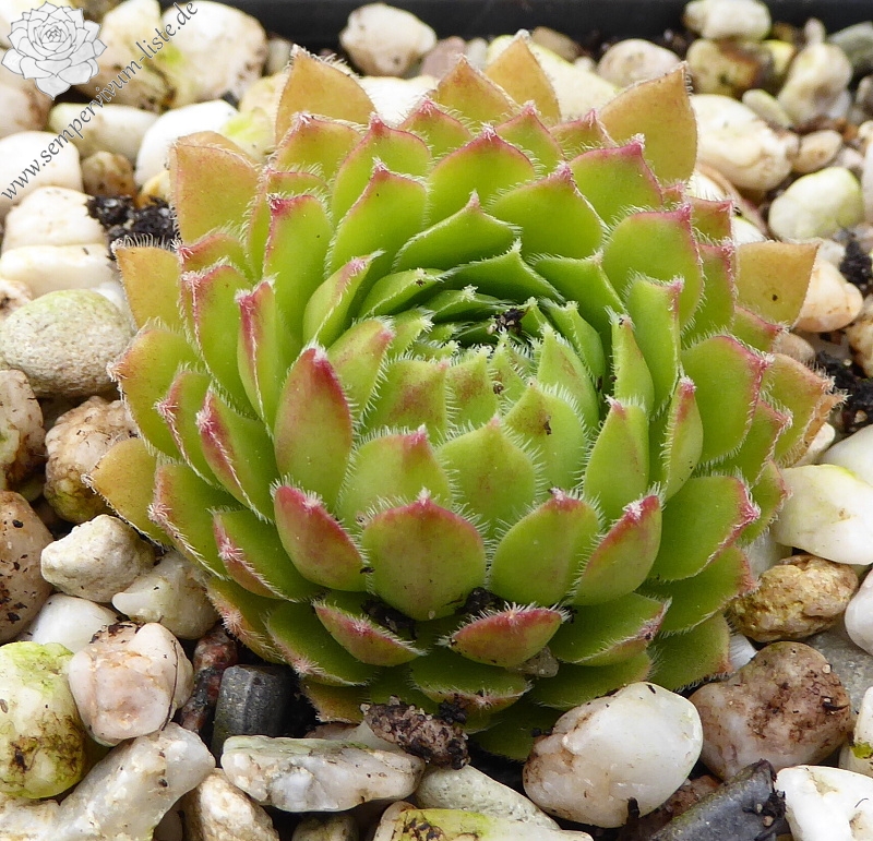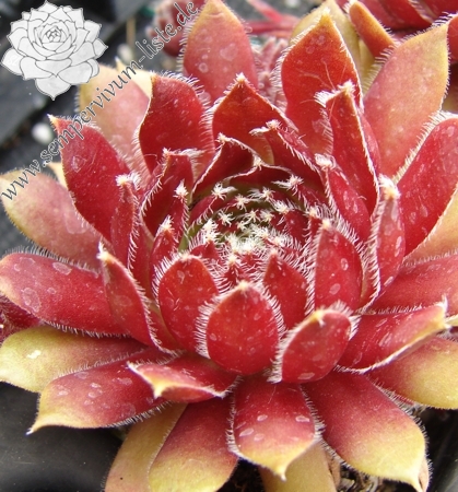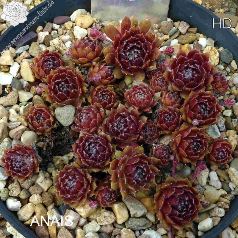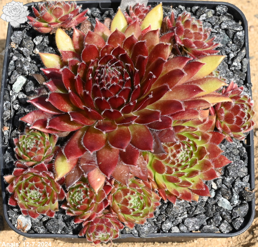 Eine grandiose Züchtung aus Belgien. Die kleineren bis mittelgroßen Rosetten zeigen eine sensationelle Frühjahrsfärbung. Die Blätter sind zu dieser Zeit erdbeerrot bis pfirsichfarben bemalt. Der Rand ist sehr kontrastreich, weiß bewimpert. Später mischen sich frisch grüne Farben zum Charakterbild von 'Anais'.