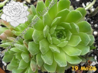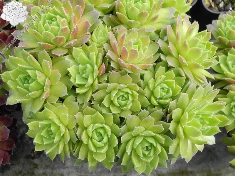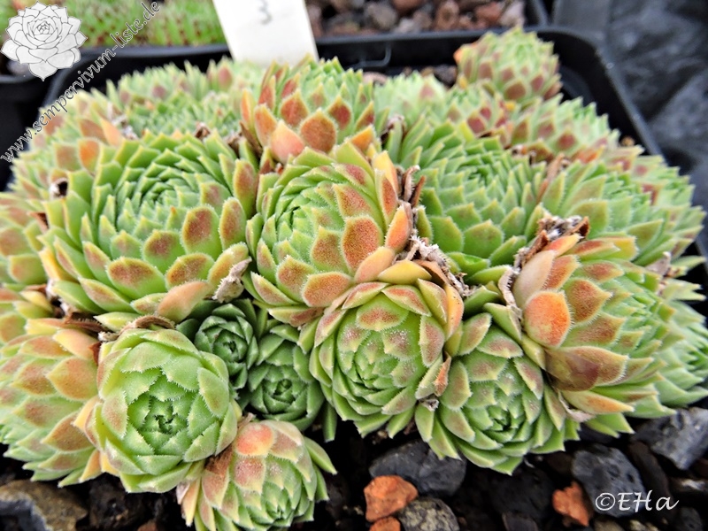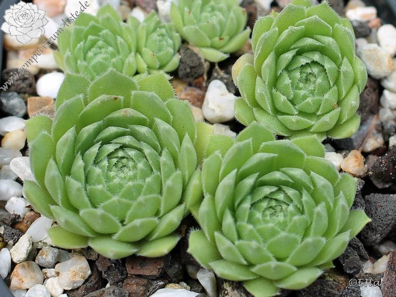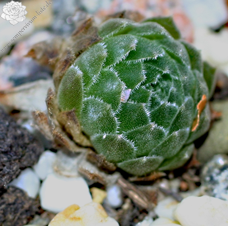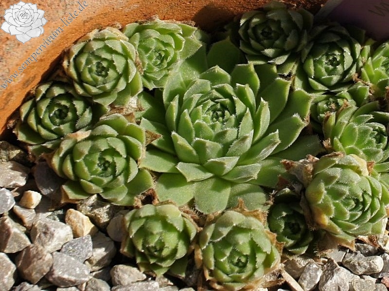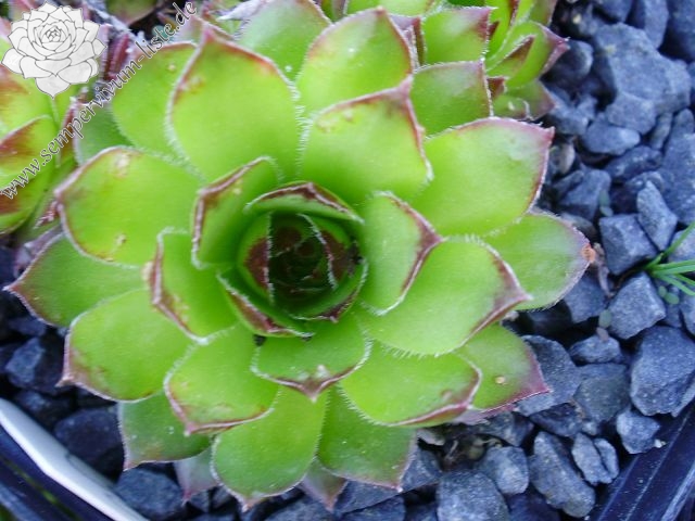 Die kugeligen, apfelgrünen Rosetten sind vom Herbst bis zum Frühling auf der Blattunterseite orange- bis pfirsichfarben angehaucht. Die Blattränder sind stark bewimpert. Früher wurde diese Art zu S. tectorum gestellt, womit Sie auch nahe verwandt ist.