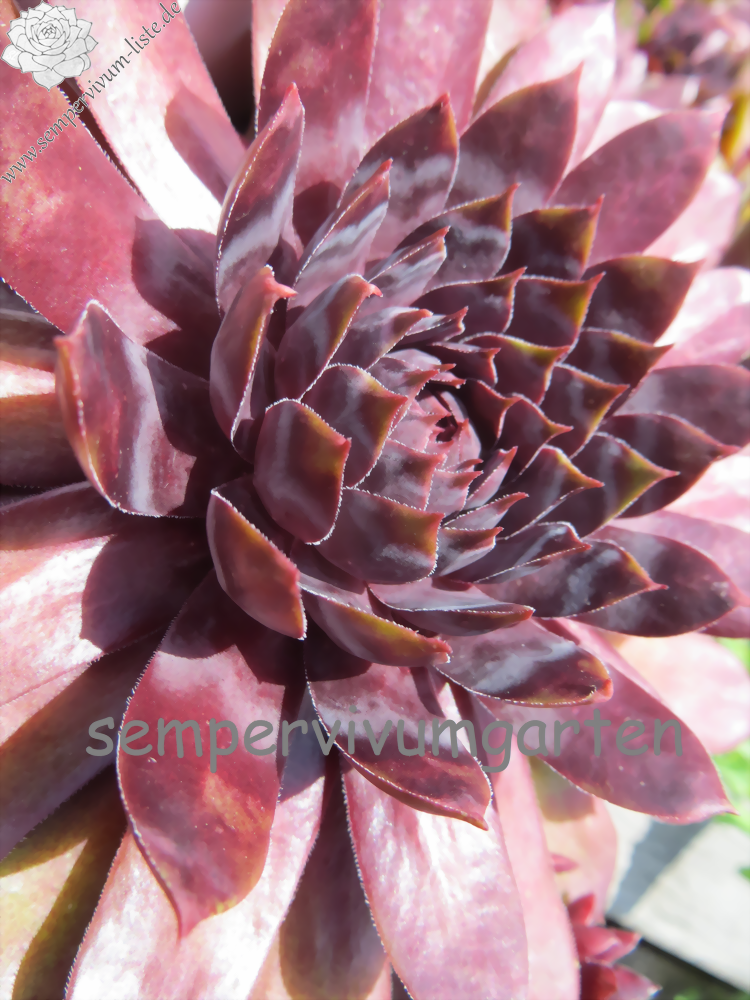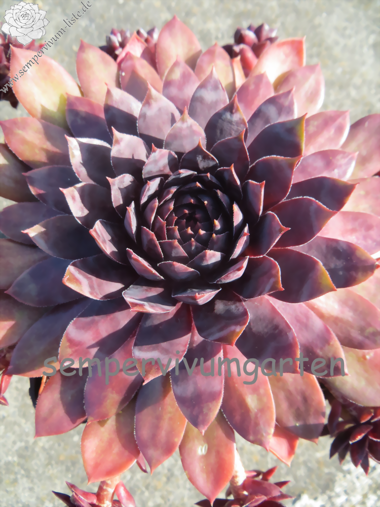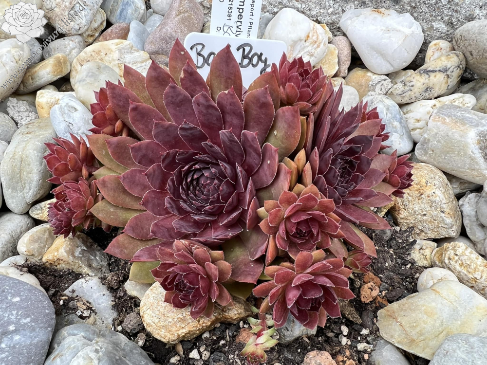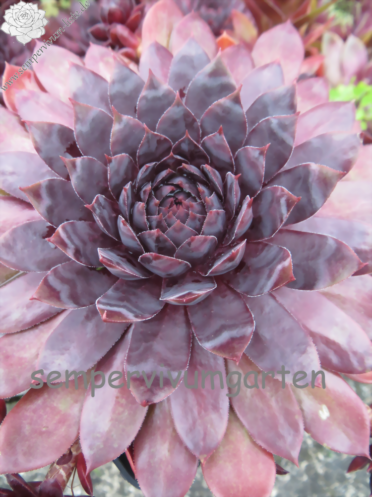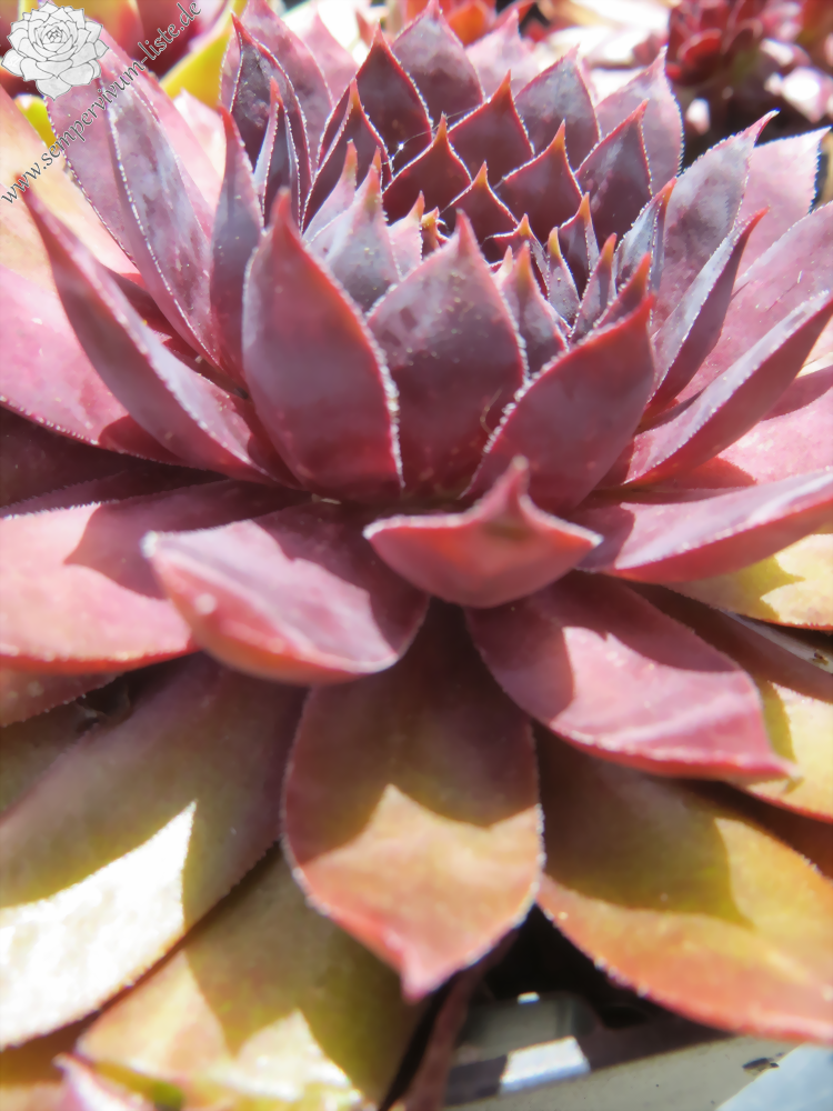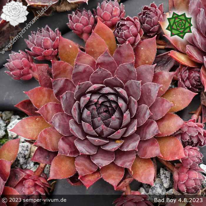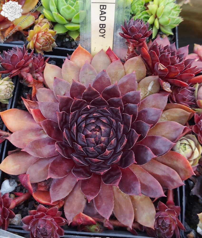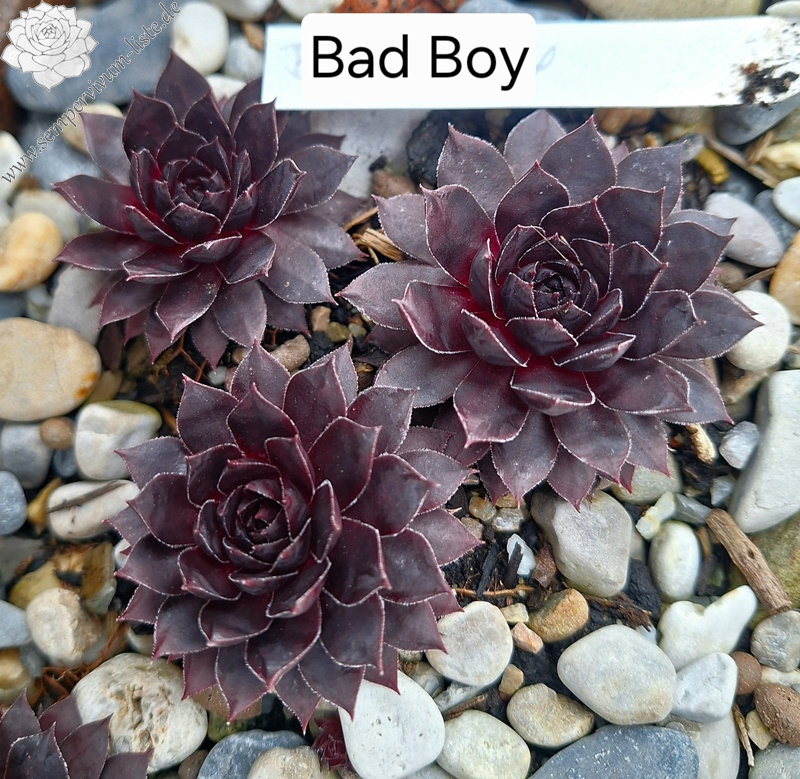 Mit Sempervivum 'Bad Boy' haben wir eine neue, sehr dunkle Züchtung im Sortiment. Die kräftigen Rosetten besitzen feste Blätter und erreichen einen Durchmesser von etwa 10cm. Sie haben sich als sehr robust gezeigt und sprossen willig. Besonders in den Sommermonaten gefällt mir ‚Bad Boy‘. Im Zentrum bleibt die dunkle Färbung sehr stabil und die Blattränder färben sich rötlich. Das große rot-lila Zentrum fällt mit den dunklen Farbtönen sofort ins Auge. Die äußeren Blattreihen besitzen eine helle Färbung und zeigen besonders im Sommer fast gelbe bis orangene Töne. Das Zentrum wirkt metallisch und hat seinen ganz eigenen Reiz.