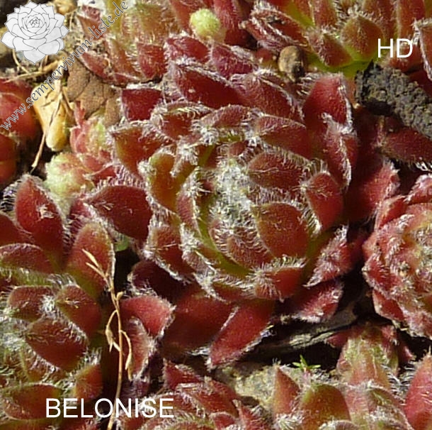 Eine schöne, sehr kühl wirkende Hauswurz. Die roten Rosetten erreichen einen Durchmesser von 5 cm und sprossen willig. Interessant ist die weiße Behaarung.