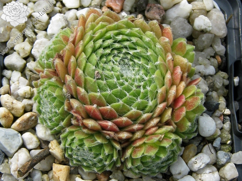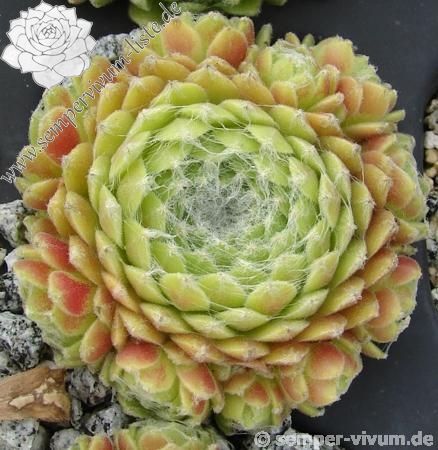 Ein kugeliger Spinnwebhauswurz von mittlerer Größe. Er formt kompakte Polster. Die Unterseite der äußeren Blätter sind in einigen Monaten rosa bis orange gefärbt. Später nimmt die grüne Grundfärbung sogar einen gelblichen Ton an.
