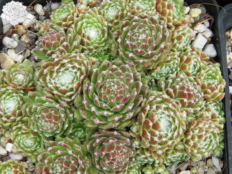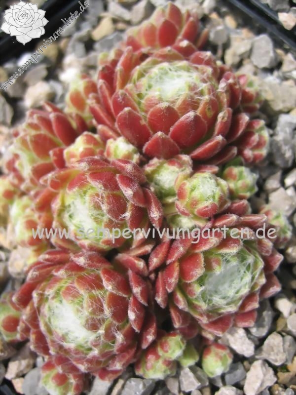 Kleine Rosetten, Blätter oval, kurz bespitzt, weissgrün, lachs überhaucht, stark besponnen.