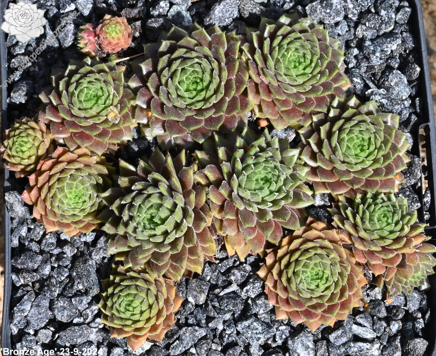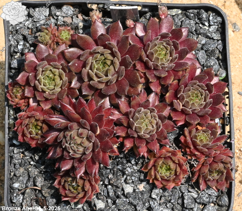 Sempervivum 'Bronze Age' ist ein mittelgroßer Hauswurz. Die Rosetten sprossen willig und bilden schöne Polster. Besonders schön sind die äußeren Blätter mit dunkelroten Farben.