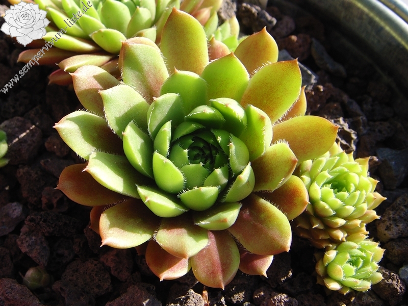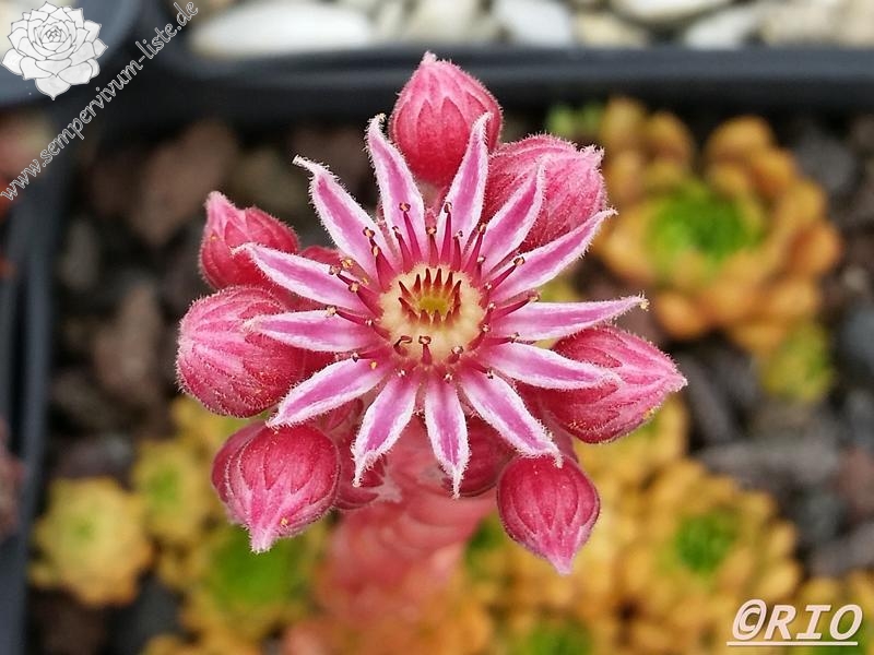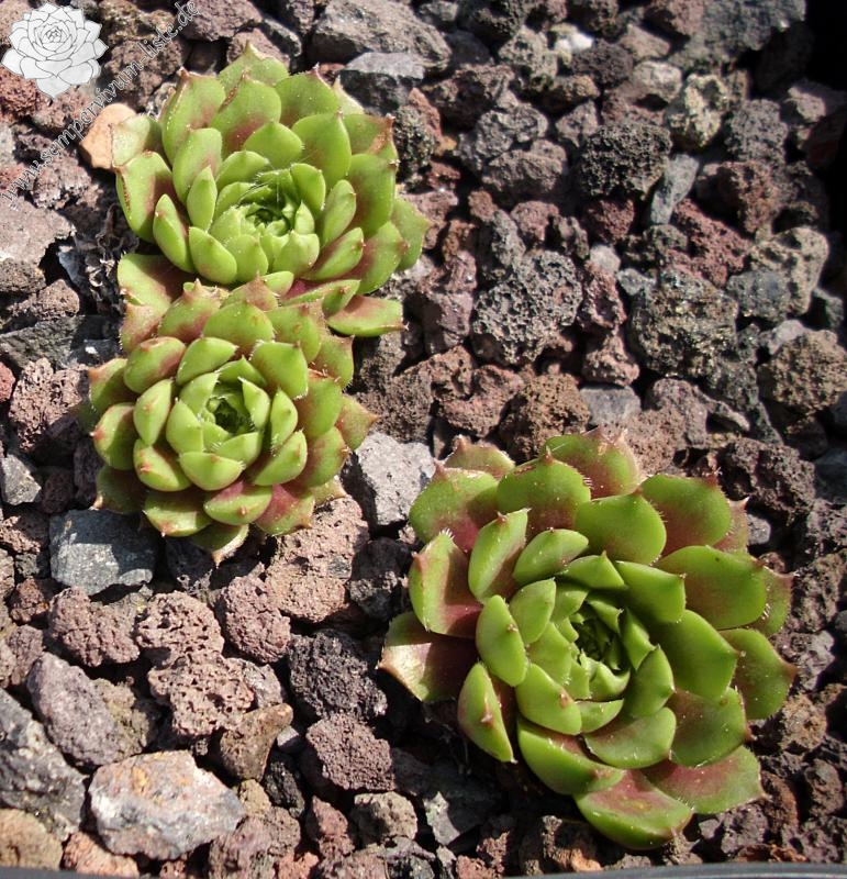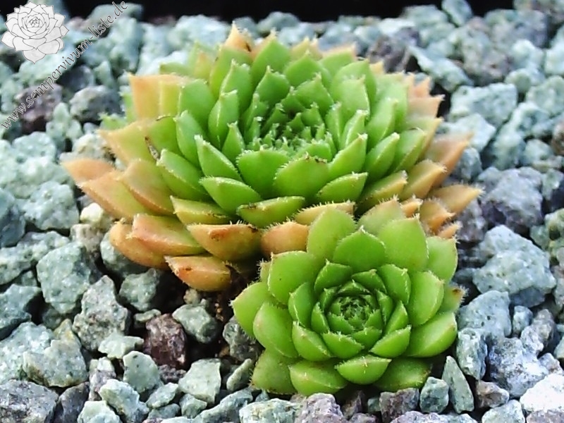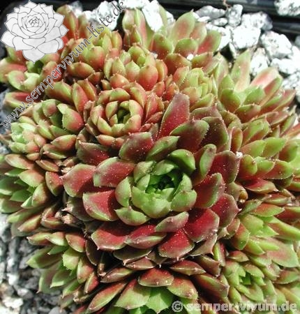 Eine der schönsten deutschen Neuzüchtungen der letzten Jahre. Die Pflanze bildet in kurzer Zeit dichte Tuffs mit kleineren apfel- bis olivgrünen Rosetten, die im Frühling schön orange getönt sind. Auffallend sind auch die purpurrosa gefärbten Blütenblätter, die hell umrandet sind.