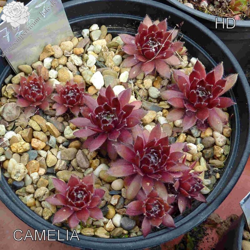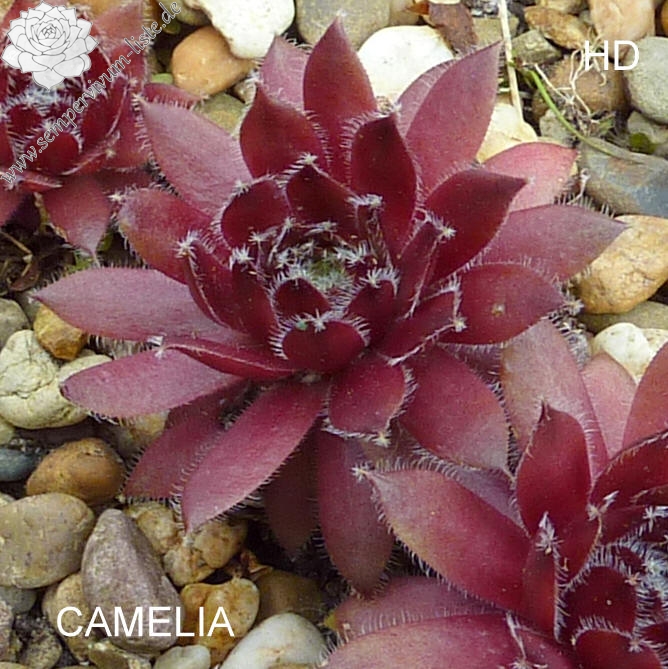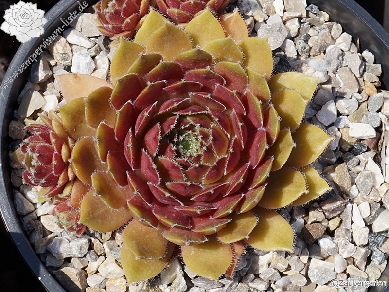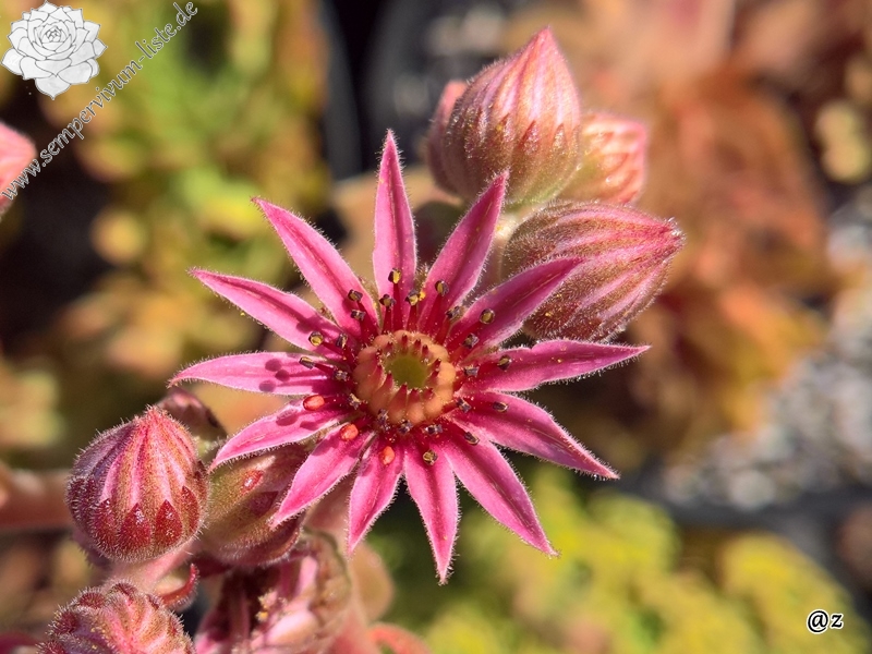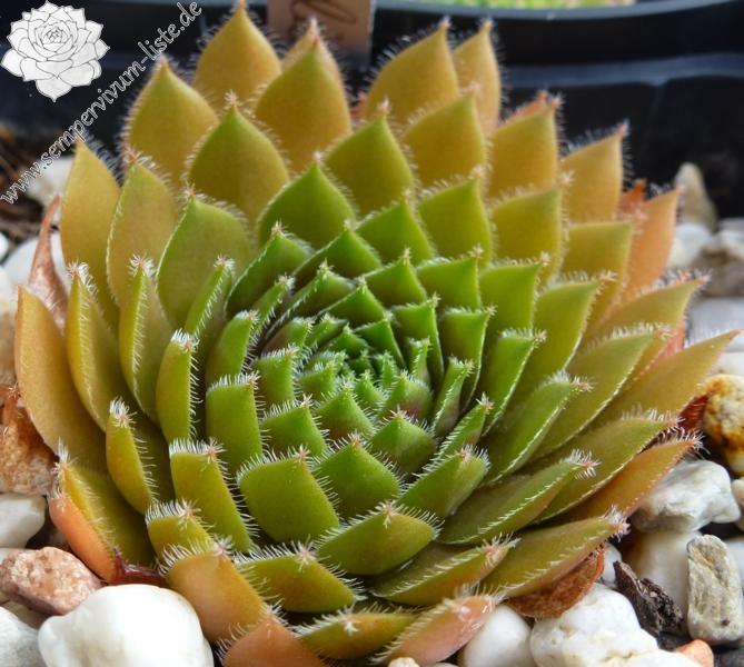 Rosetten bis 6 cm, Blätter lanzettlich, rotpurpur, später in beige übergehend, an den Spitzen kleine Haarbüschel.