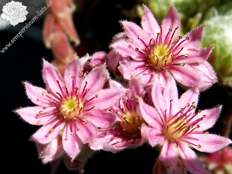 kleine braunrote Rosetten, innen grün, stark spinnwebartig behaart, Rosetten 3 cm