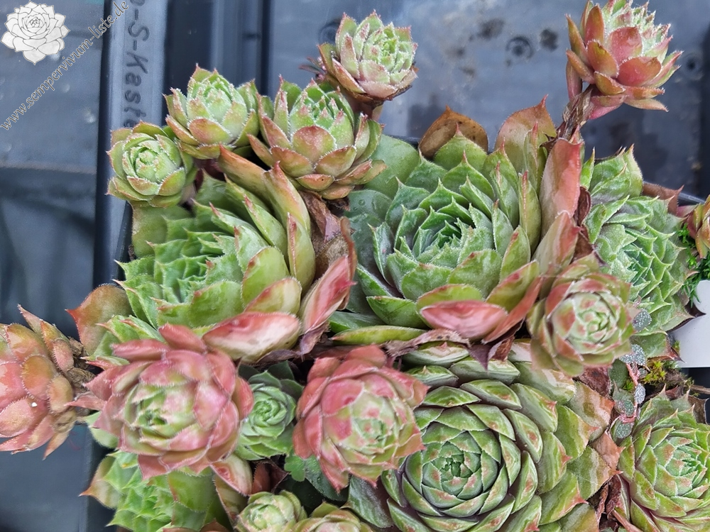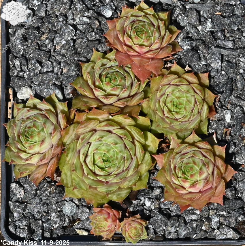 Mit Sempervivum 'Candy Kiss' haben wir eine ganz neue, kühl gefärbte Züchtung im Sortiment. Sie erreicht einen Durchmesser von 9 cm und sprosst willig. Die wohl geformten Rosetten zeigen sich sehr robust und haben mit hohen Temperaturen im Sommer keine Probleme. Im Frühjahr starten die Pflanzen dunkler gefärbt und werden mit steigenden Temperaturen immer heller. Besonders auffallend sind natürlich die orangen Blattenden in Verbindung mit den fast grauen Tönen im Zentrum. Bis jetzt zeigen sich nur selten Blüten, die gerne von Insekten besucht werden.