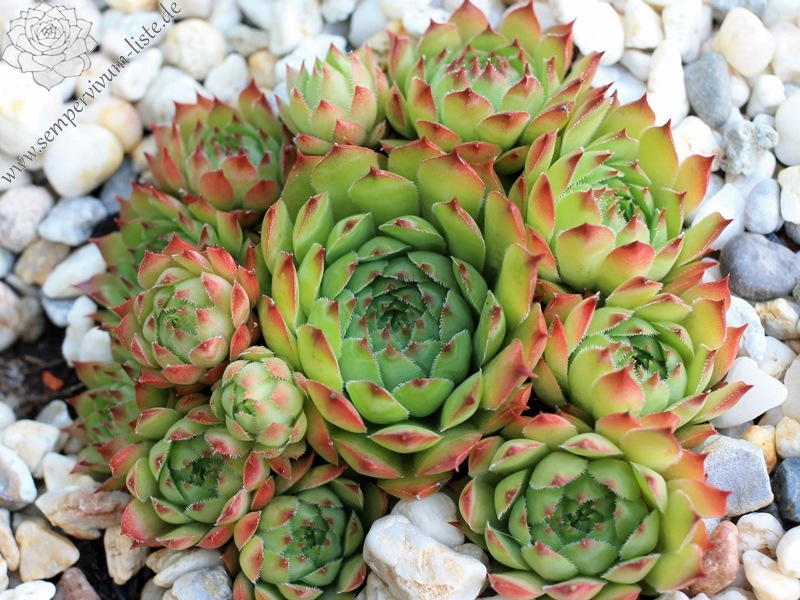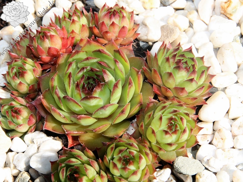 Hier haben wir eine kleine frischgrüne Sorte, die im Sommer leuchtend rote Spitzen zeigt. Die kleinen Rosetten bilden schnell sehr dichte Polster. Leider erscheinen die grünen Sorten zwischen den anderen farbigen Sorten fast schon etwas unauffällig. Hier täuscht jedoch der erste Eindruck. Bei dieser Sorte handelt es sich um eine sehr gute Züchtung, welche im Sortiment besonders im Sommer deutlich erstrahlt.