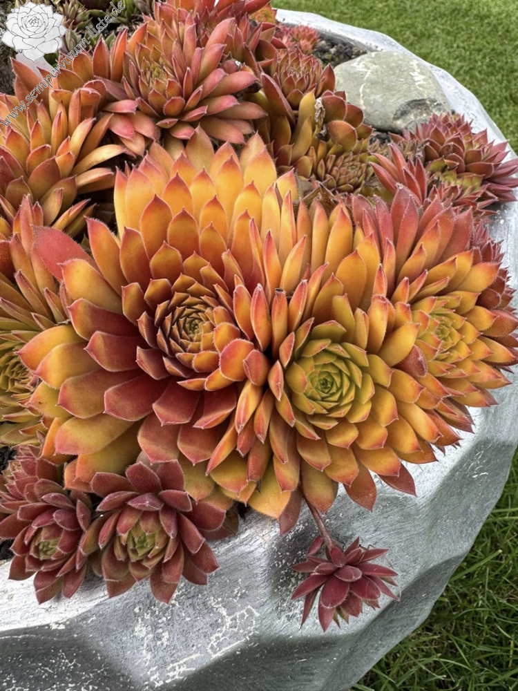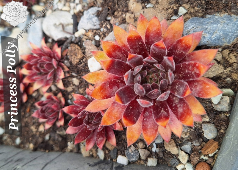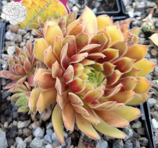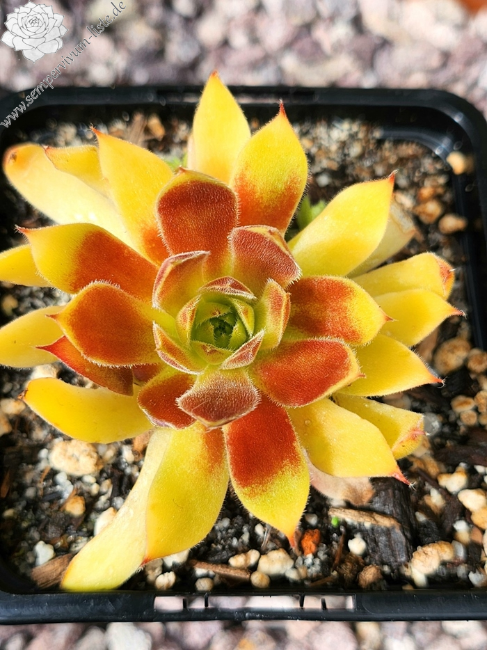 Die leuchtend gelben Rosetten von Sempervivum Chick Charmlettes „Princess Polly“ zeigen je nach Jahreszeit eine rubinrote Mitte oder rote Blattspitzen. PPAF