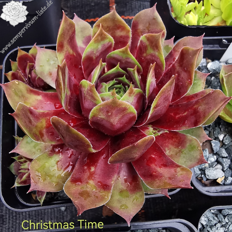 Wir haben hier den echten Klon für Sie vermehrt.'Christmas Time' zeigt im Frühjahr eine recht dunkle, auberginefarbene Tönung, die sich während der Sommermonate im Zentrum zu Kirschrot wandelt, wobei die äußeren drei Viertel der Blätter in hellem jadegrün aufblättern. Zu dieser Zeit messen die Rosetten einen Durchmesser von bis zu 15 Zentimetern.