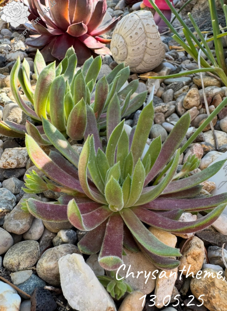 Im Frühjahr und Sommer zeichnen sich die Rosetten durch ihre schönen, steil nach oben gerichteten Blättern aus. Die samtigen, langen Blätter sind 1 cm breit und haben eine linealische Form, die steil nach oben zeigt. Anfangs zeigen die hellgrünen Blätter im Frühling leichte rote Töne, die im Sommer intensiver werden. Immer grün leuchtet das Herz der Rosetten. Die Blätter weisen unterschiedlich ausgeprägte Dornen auf, die manchmal sogar in Richtung des Herzens gebogen sein können. Im Spätherbst wird die 'Chrysantheme', wie viele andere Sorten grün und überwintert dann als kleine, samtige, flache Rosette. Diese Sorte wächst gut und verträgt lange Hitze sowie längeren Regen ohne Probleme.