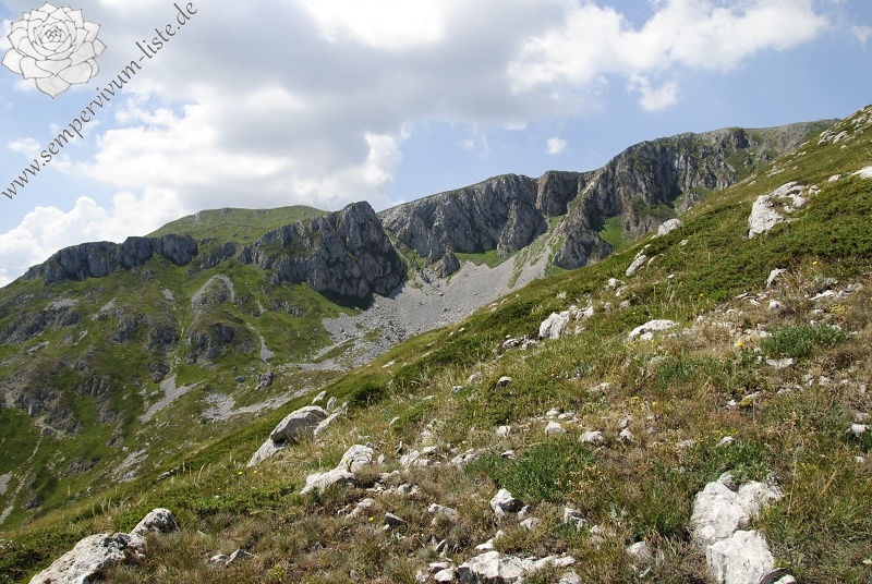 Beschreibung der Pflanzen: Ziemlich viele Rosetten am Naturstandort haben die neuen Ausläufer gebildet. Die Ausläufer wurden bei der Mutterrosette braun gefärbt, am Ende wurden sie lila gefärbt. Die Ausläufer sind lang und enthalten kleine Blätter. Viele Rosetten wurden auch interessant gefärbt. Die äußere Rosettenblätter wurden lila, dunkel rot, rot oder braunrot gefärbt. Die Färbung der Rosettenblätter ist also sehr variabel am Naturstandort. Am Naturstandort habe ich auch blühende einige Rosetten beobachtet. Ich glaube, während meines Besuches des Naturstandortes war etwa die Mitte der Blütezeit. Die Blüten von Sempervivum ciliosum sind anders als die Blüten von Sempervivum octopodes. Die Kronblätter von Sempervivum ciliosum sind immer gelb oder grüngelb gefärbt, keine rote (oder lila) Flecke an der Basis der Kronblätter. Die Kronblätter von Sempervivum ciliosum sind ein bisschen breiter als die Kronblätter von Sempervivum octopodes. Die Staubfäden von Sempervivum ciliosum sind immer nur grün gefärbt.