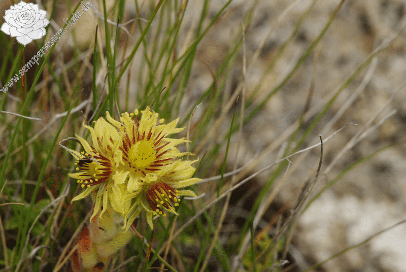 Beschreibung der Pflanzen: Alle Rosetten am Naturstandort waren sehr klein. Viele Rosetten hatten die äußere Rosettenblätter rot gefärbt, fast alle Rosetten haben die dunkel lila gefärbten Spitzen der Rosettenblätter. Einige Rosetten haben die Ausläufer am Naturstandort gebildet. Am Naturstandort habe ich auch die blühenden Rosetten beobachtet. Die Blüten, die ich am Naturstandort gesehen habe, hatten ziemlich viele Rosettenblätter. Die Kronblätter aller Blüten waren hell gelb gefärbt, ohne rote Flecke an der Basis, die Staubfäden waren rot (oder hell lila) gefärbt. Alle Rosetten am Naturstandort waren in guten Zustand.