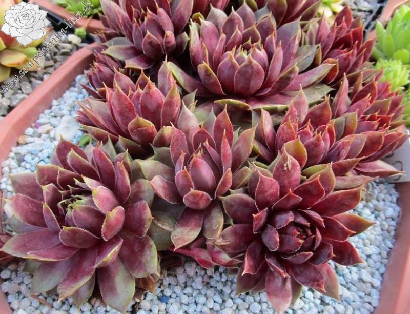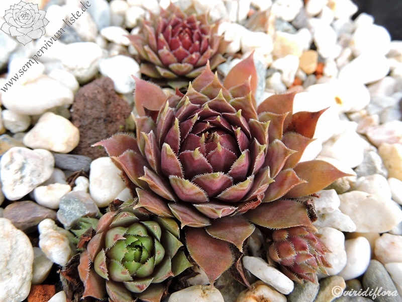 Schöne kleine Rosetten, die ganz dichte, hüglige Polster bilden! Die kühle Färbung wird durch die roten Blattspitzen schön abgerundet.