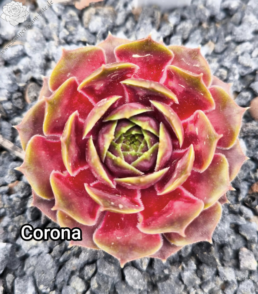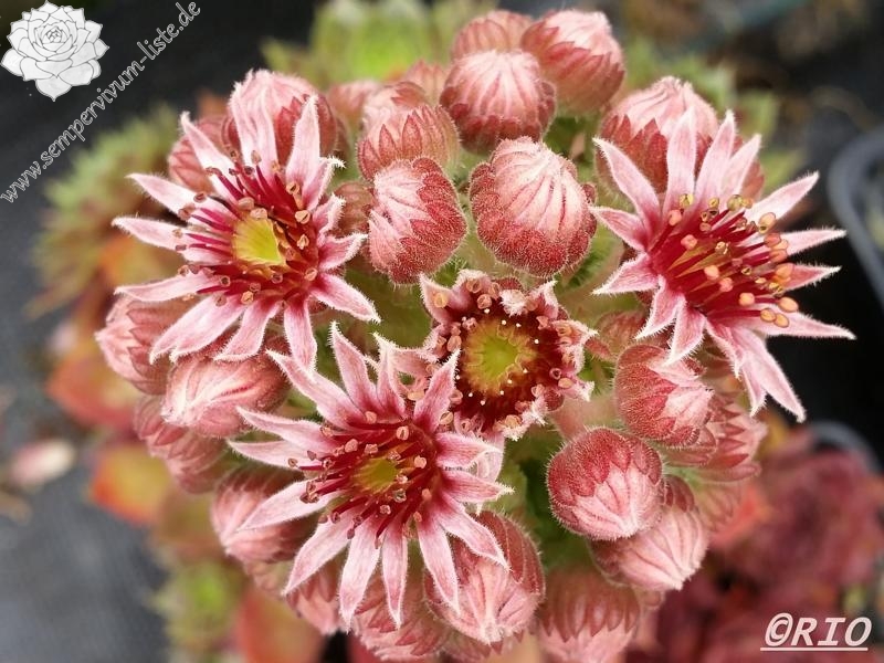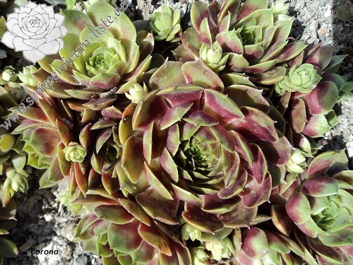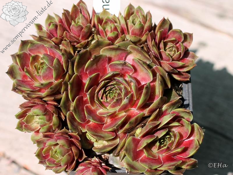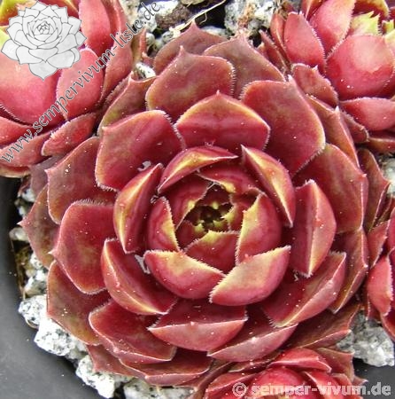 Zumeist perfekt geformte Rosetten, im Frühling in granat- bis purpurroter Farbe. Auch unter dem Namen "Cororo" in Kultur.