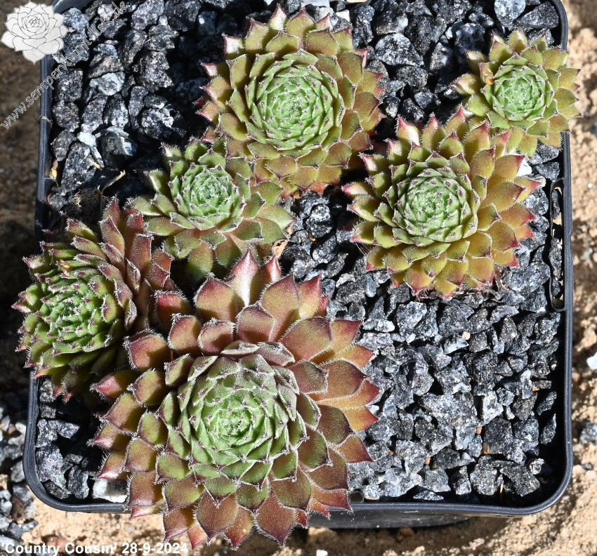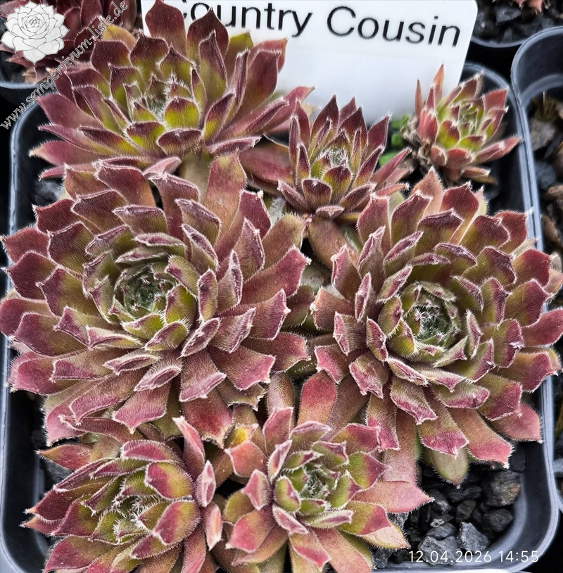 Sempervivum 'Country Cousin' besitzt rötliche Blattspitzen mit leichter Behaarung. Die mittelgroßen Rosetten erreichen einen Durchmesser von etwa 5cm und sprossen gut.