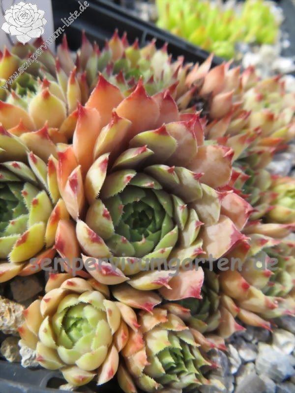 Mit 'Dainty Lass' haben wir ebenfalls eine wüchsige Sempervivum, mit besonderem Charme. Besonders gut gefallen mir die leuchtend roten Blattspitzen, die sich deutlich abheben. Die mittelgroßen Rosetten sprossen gut. Deutlich ist das Sempervivum calcareum Blut zu erkennen!