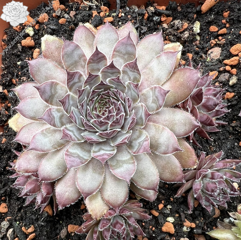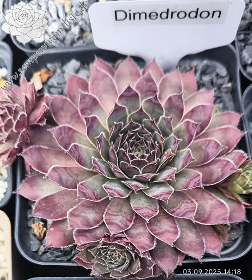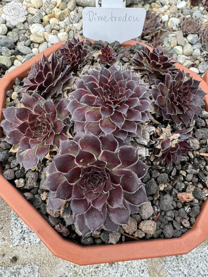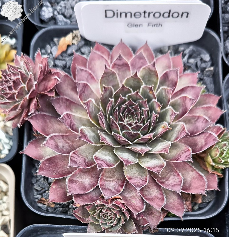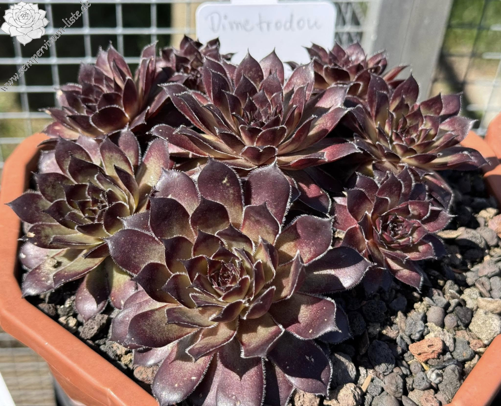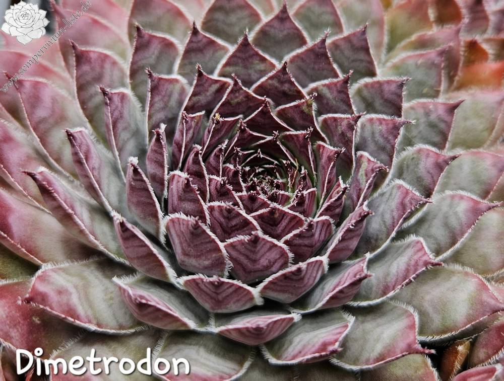 'Dimetrodon' ist ein Zufallssämling und zeigt sich als sehr unempfindlich. Er kommt mit allen Wetterlagen gut zurecht. Die Rosetten haben einen Durchmesser von ca. 7 cm. Interessant ist die starke Bewimperung der Blattränder. Die marmorierte Färbung hält sich das ganze Jahr. Die Kindelbildung ist außergewöhnlich gut.
