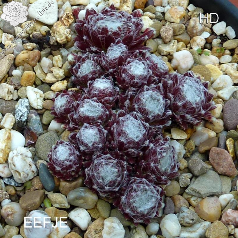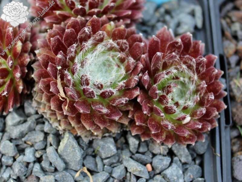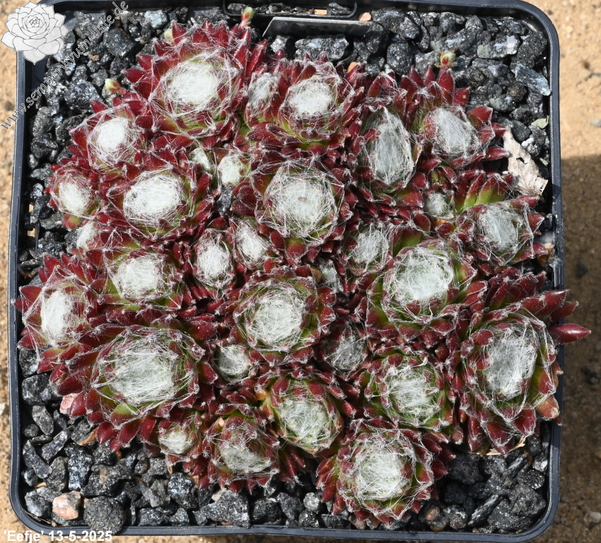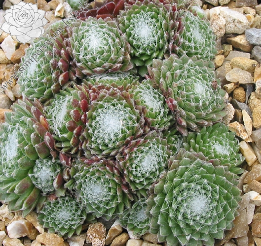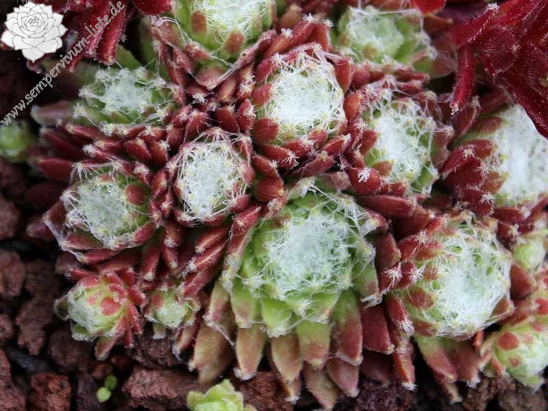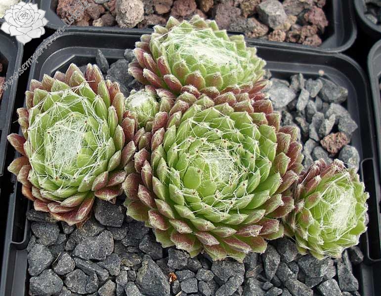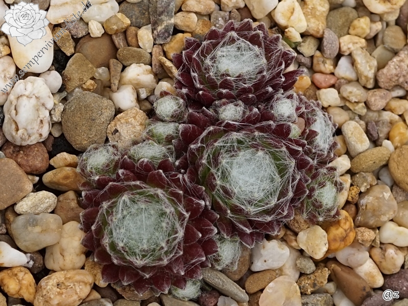 Ein besonders schöner Spinnwebhauswurz mit dicht besponnenen Rosettenzentrum. Besonders im Frühjahr, wegen den rötlichen Rosettenrändern auffallend!