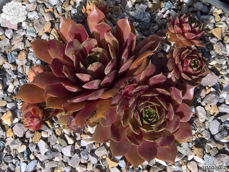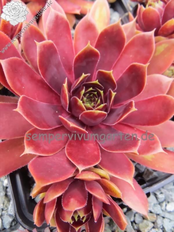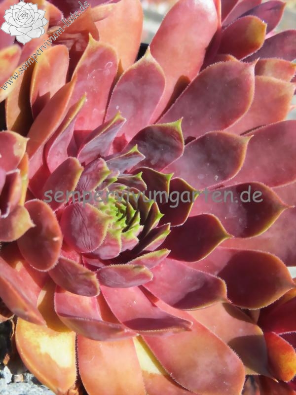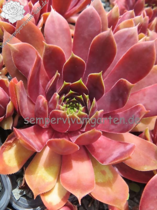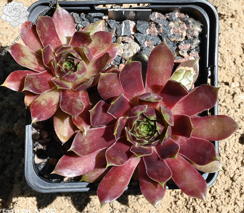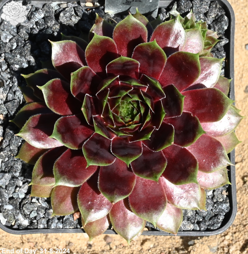 Sempervivum 'End of Day' ist ein größerer Sämling von der bekannten Sorte 'Romiley'. Die offenen Rosetten erreichen einen Durchmesser von über 9 cm und besitzen breite Blätter. Die Färbung wechselt je nach Jahreszeit auffallend und präsentiert immer kräftige Farben, die sich auch bei höheren Temperaturen sehr gut halten. Die verschiedenen Rottöne erzeugen ein harmonisches Bild, dass durch die hellen Blatträndern abgerundet wird. Besonders im Zentrum fallen die hell gefärbten Ränder deutlich auf und erzeugen fast ein grünes Herz. Im Sommer färben sich die äußeren Blätter heller und verleihen der Pflanze eine sehr bunte Wirkung. Es handelt sich um robuste Pflanzen, die gut und willig sprossen.