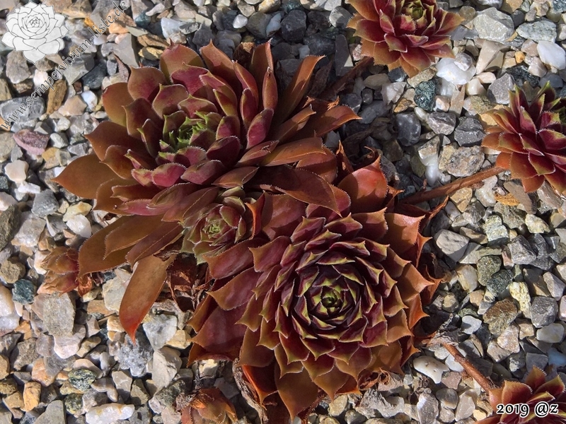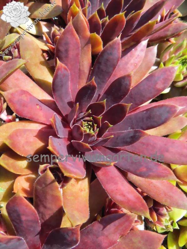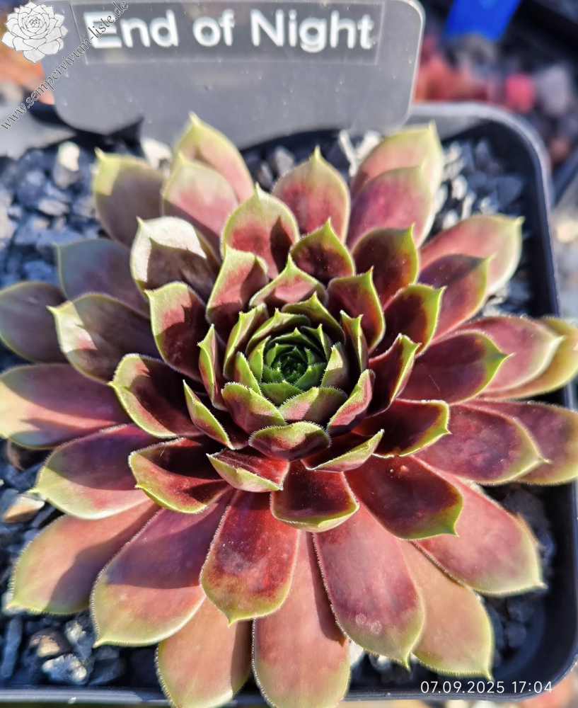 Sempervivum 'End of Night' ist ein größerer Sämling von der bekannten Sorte 'Romiley'. Die offenen Rosetten erreichen einen Durchmesser von über 9 cm und besitzen schmale Blätter. Die Färbung wechselt je nach Jahreszeit auffallend und präsentiert immer kräftige Farben, die sich auch bei höheren Temperaturen sehr gut halten. Im Frühjahr starten die Rosetten mit sehr dunklen Farben, die sich im Rosettenzentrum gut halten. Die äußeren Blätter färben sich baldin ganz einheitlich ockergelben Farben und besitzen eine sehr schmale, lange Wirkung. Im Zentrum bilden verschiedene Rot- und Lilatönen ein harmonisches Bild, dass durch die hellen Blatträndern abgerundet wird. Besonders im Zentrum fallen die hell gefärbten Blattspitzen deutlich auf und erzeugen fast ein grünes Herz. Es handelt sich um robuste Pflanzen, die leider nur mäßig sprossen.