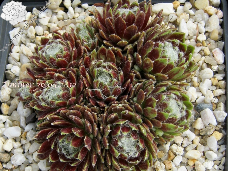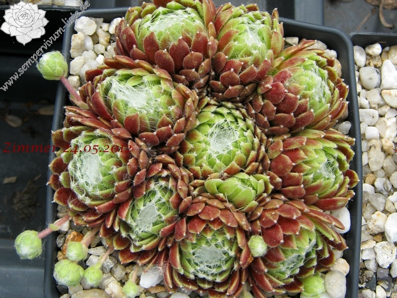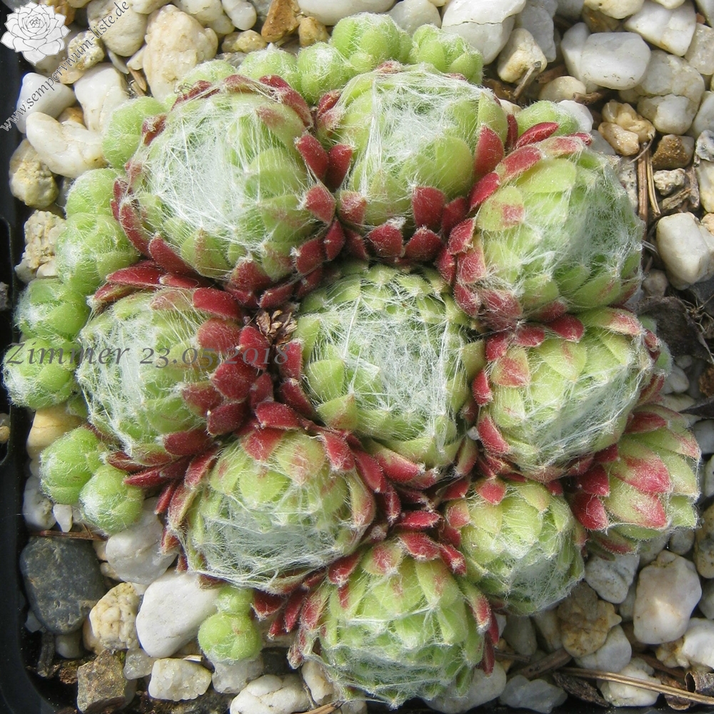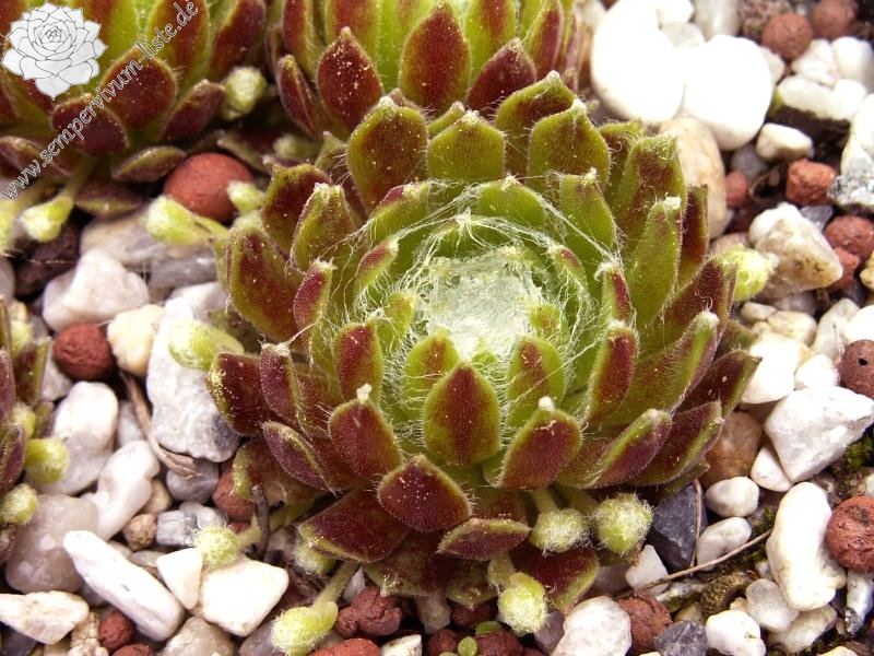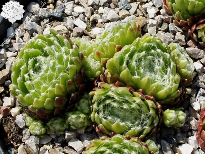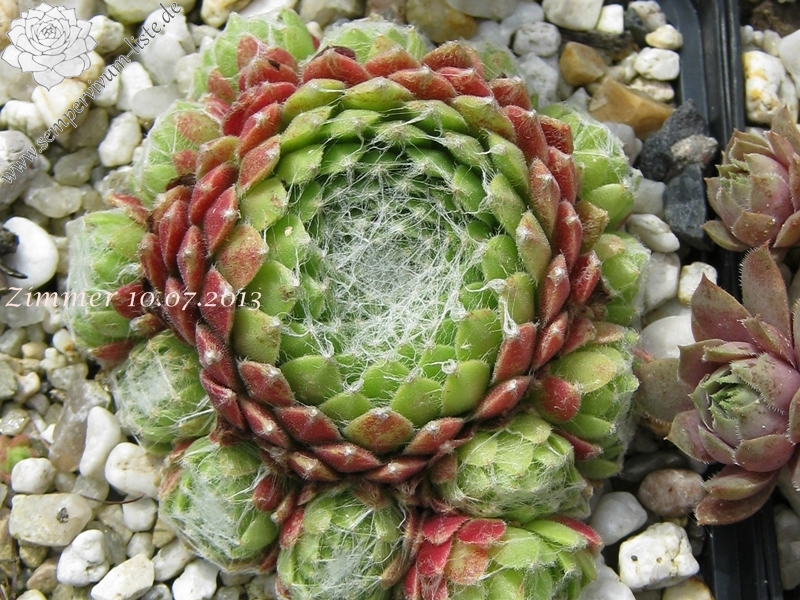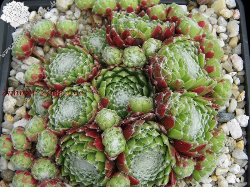 Rosetten 1-1,5 cm, kugelig, gelbgrün, außen rosa, Spinnweben