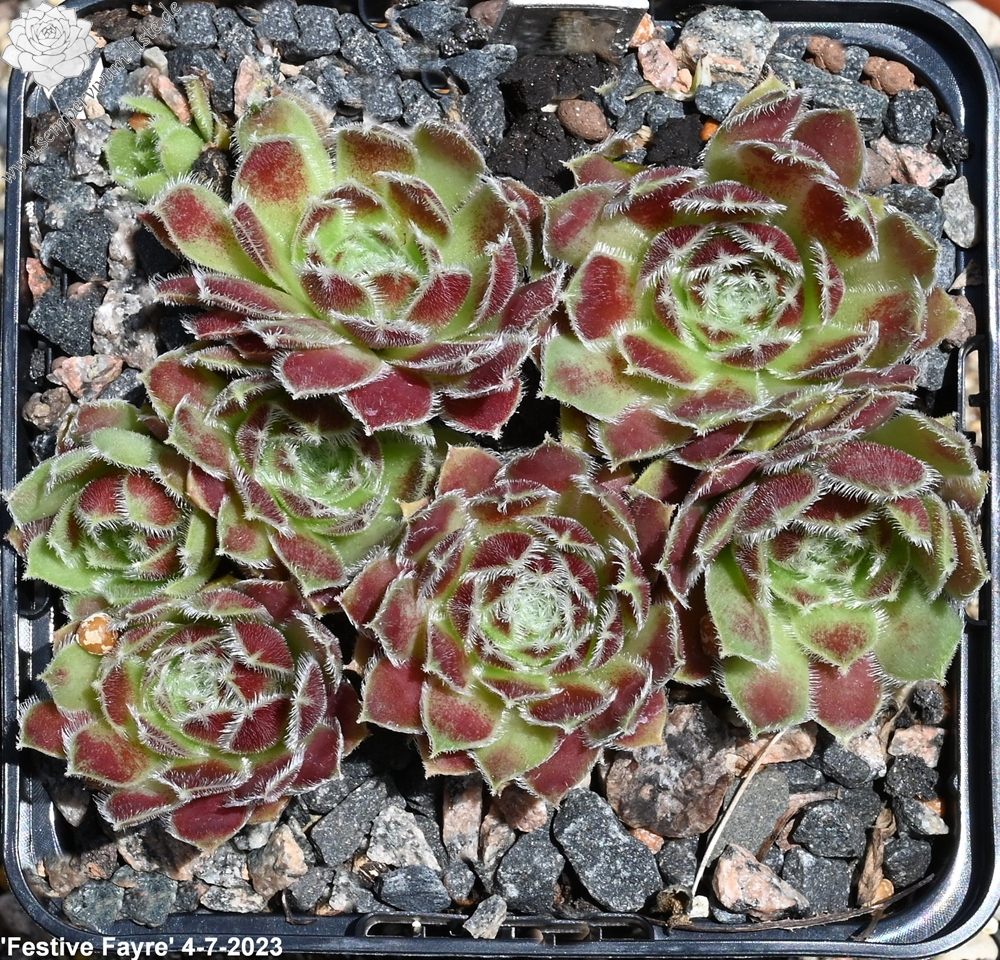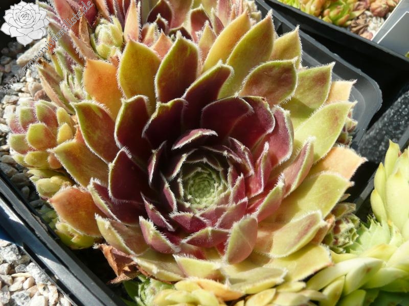 Sempervivum 'Festive Fayre' zeigt schöne, rötlich Blätter mit leichter Behaarung an den Blatträndern. Die Pflanzen sprossen willig.