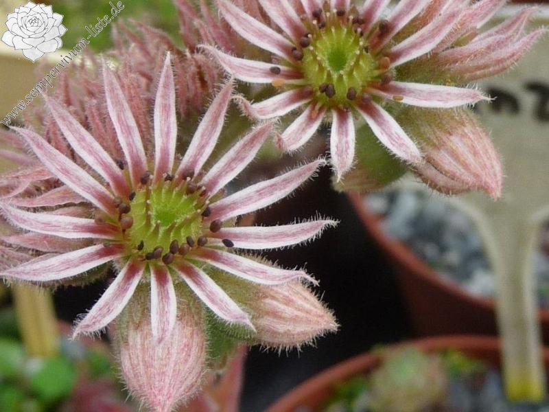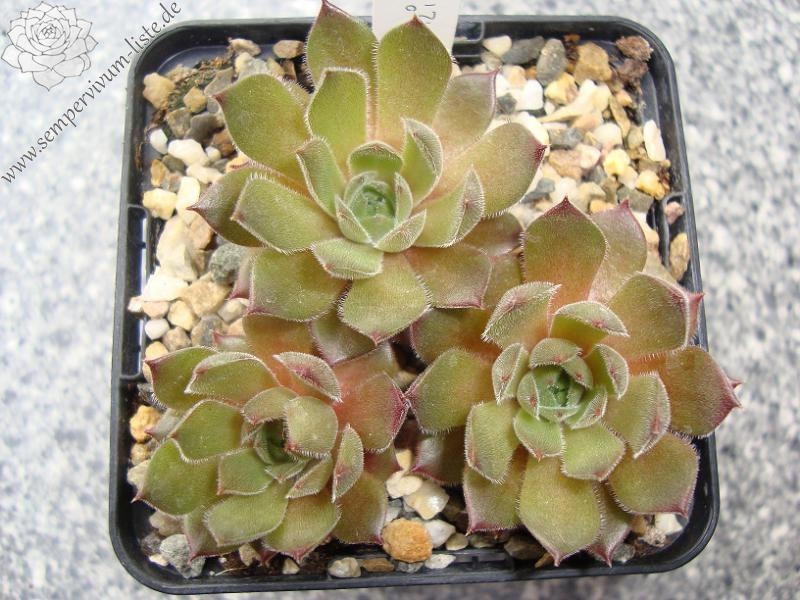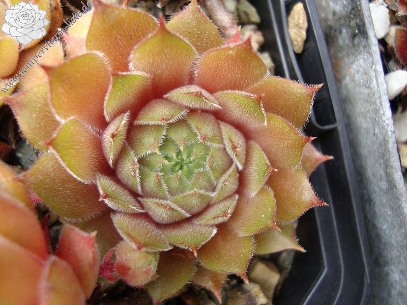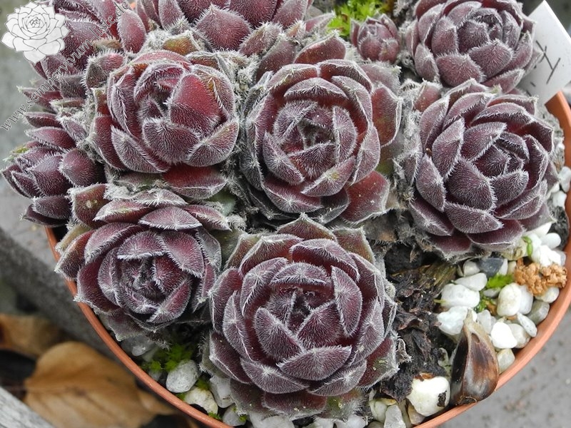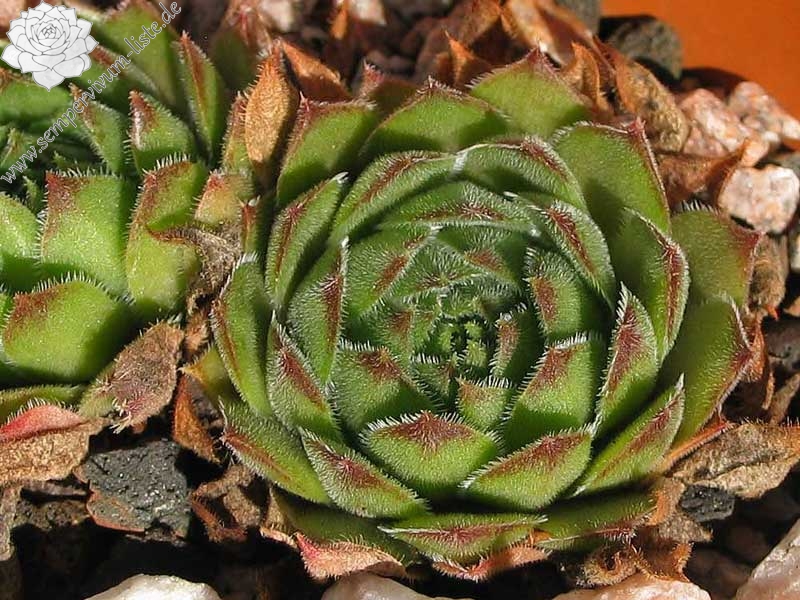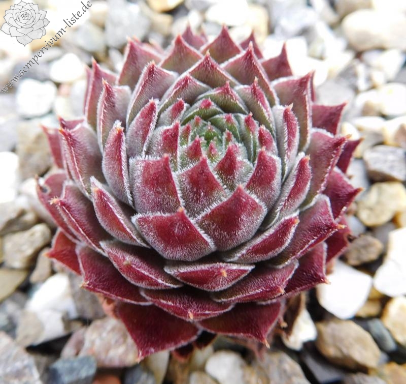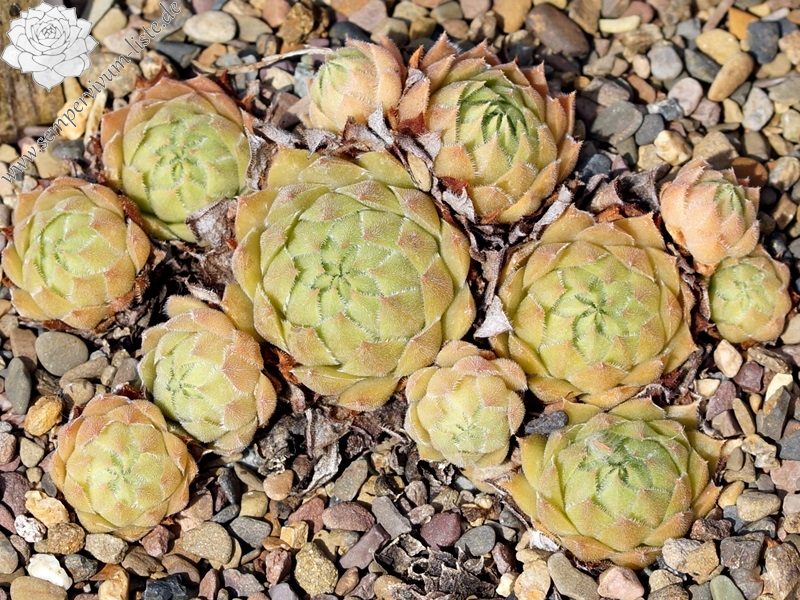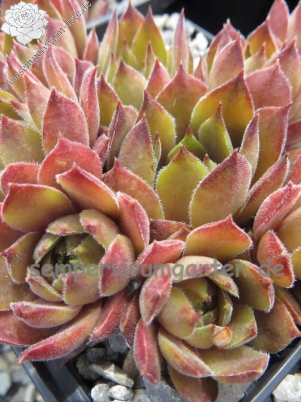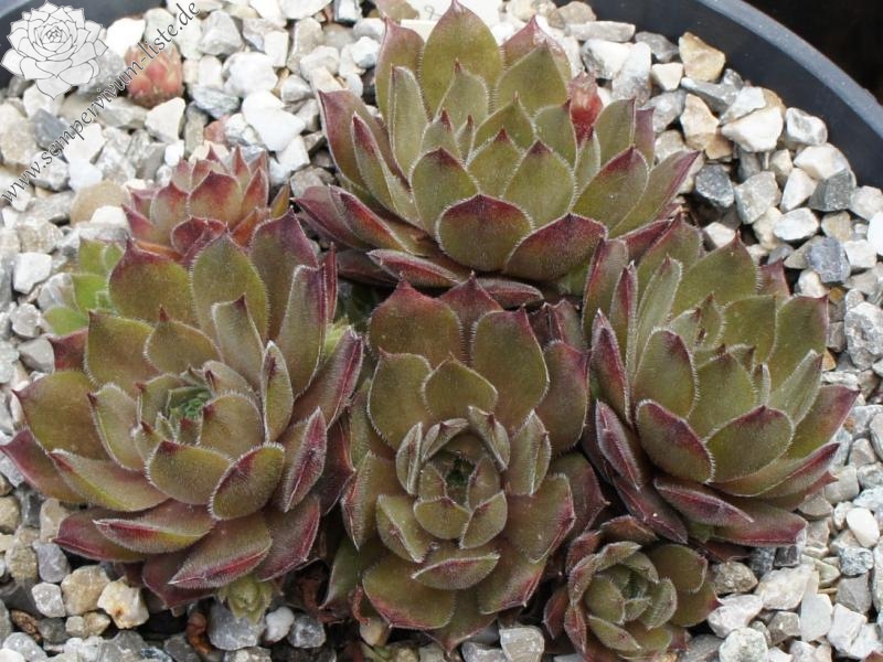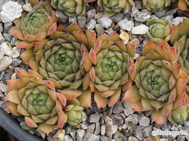 Mit Sempervivum cv. Fränzi haben wir eine wüchsige Dachwurz, die einen ganz samtigen Eindruck macht. Schön sind die rötlich gefärbten Blattenden. Die Rosetten sprossen gut und bilden ganz dichte Polster.