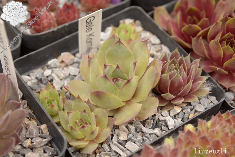 Sempervivum 'Gele Komeet' ist eine mittelgroße Hauswurz mit kräftigen Blättern. Die dunkelroten Blattenden verleihen der Pflanze eine ganz besondere Wirkung. Die Rosetten sprossen gut. Noch viel zu selten in den Sammlungen!
