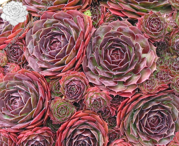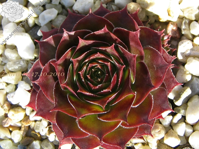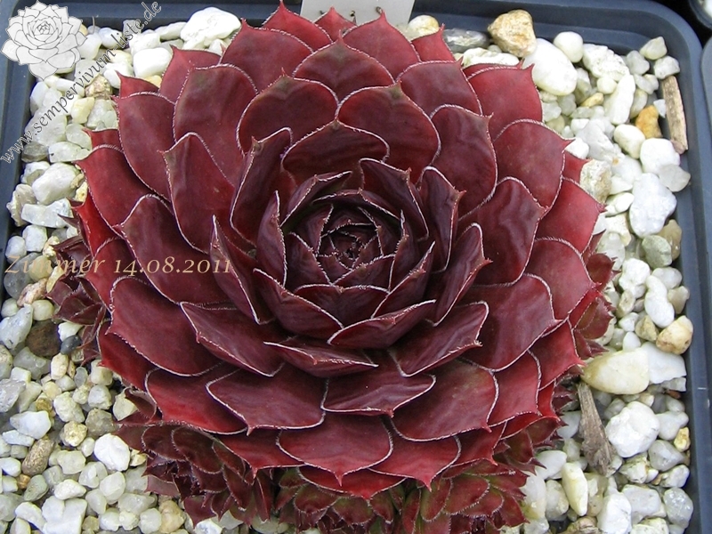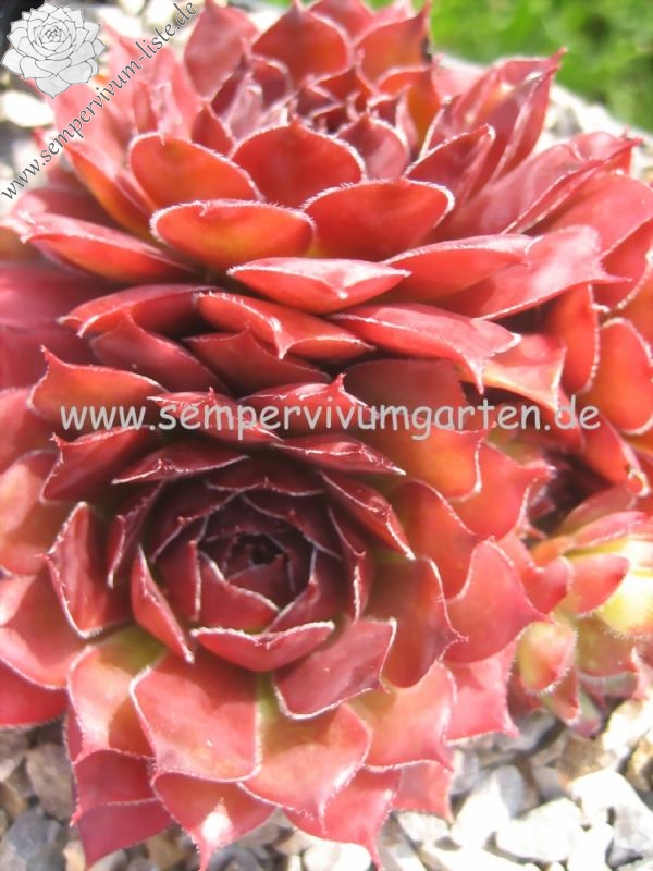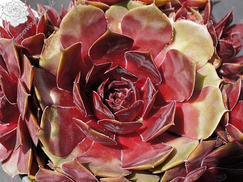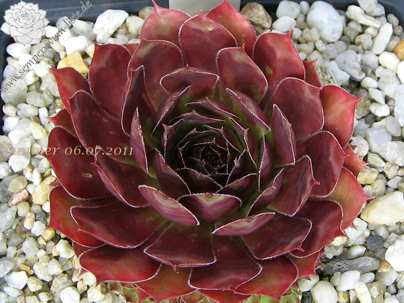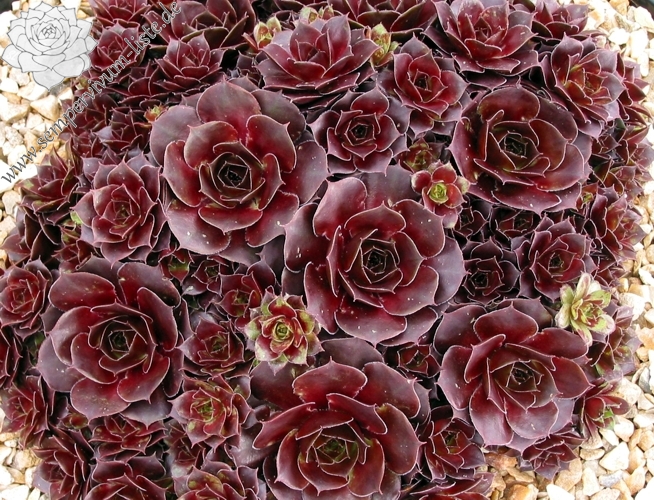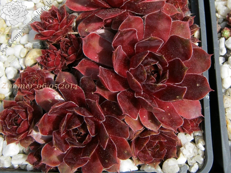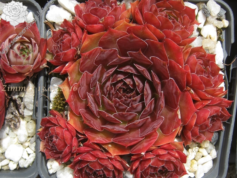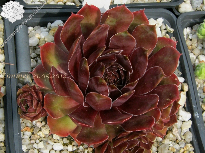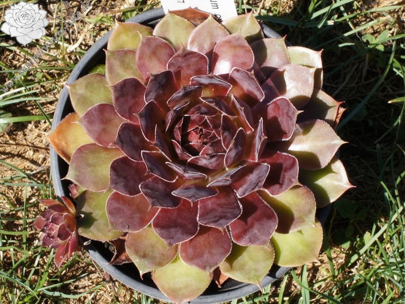 Hellgrüne Rosetten, mit breiten Blättern und breiten rotlila Blattenden. Dichte, kräftige Polster!