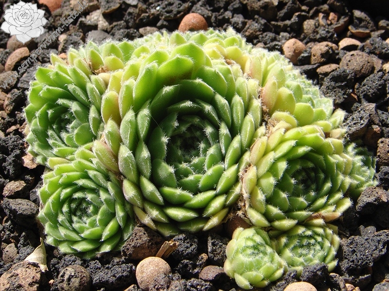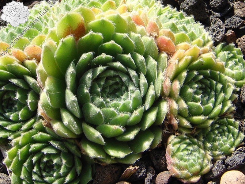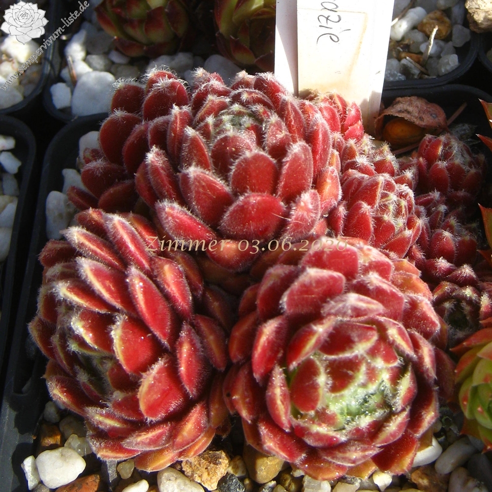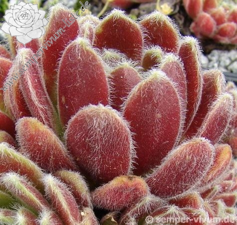 sehr aparte Sorte, mittelgroße, flachrunde, und silbrig behaarte Rosetten, Spitzen ausgeprägt bewimpert, Grund olivgrün, dunkle Spitzen, Blüte rosa, 15 - 20 cm