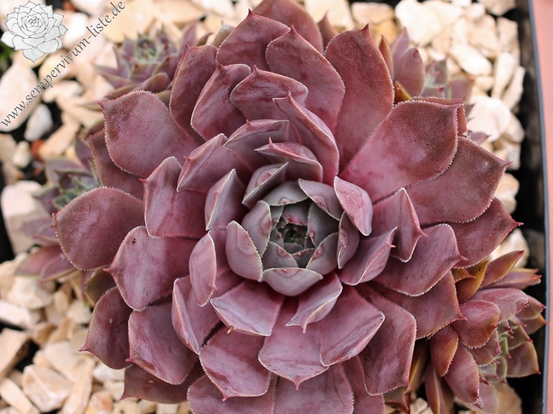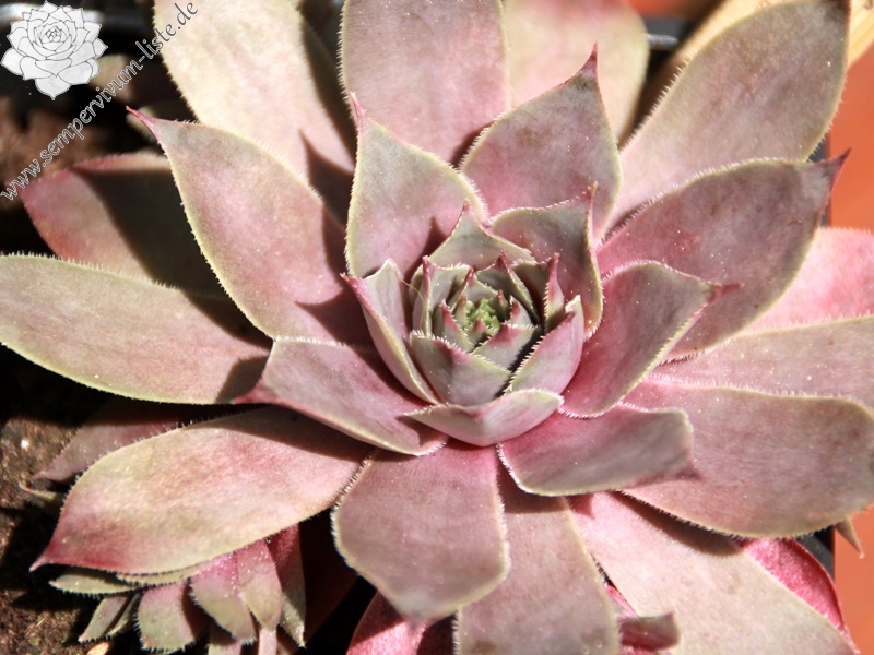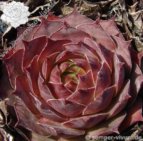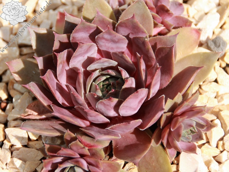 Der "Graue Stern" formt größere, perfekt geformte Rosetten mit einer interessanten Winterfärbung. Die Blätter schmücken sich zu dieser Zeit mit rosafarbenen bis violetten Tönen, der Rand ist leicht silbrig bewimpert.