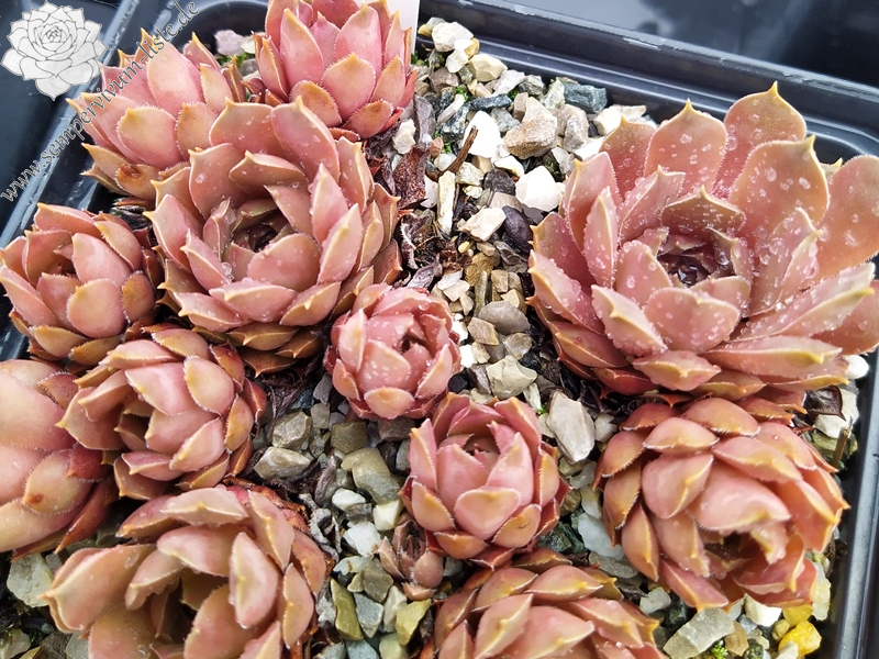 Rosetten bis 6 cm, ockerfarben später ins olivgrün gehend, Ableger an dicken kurzen Stolonen, Zufallssämling