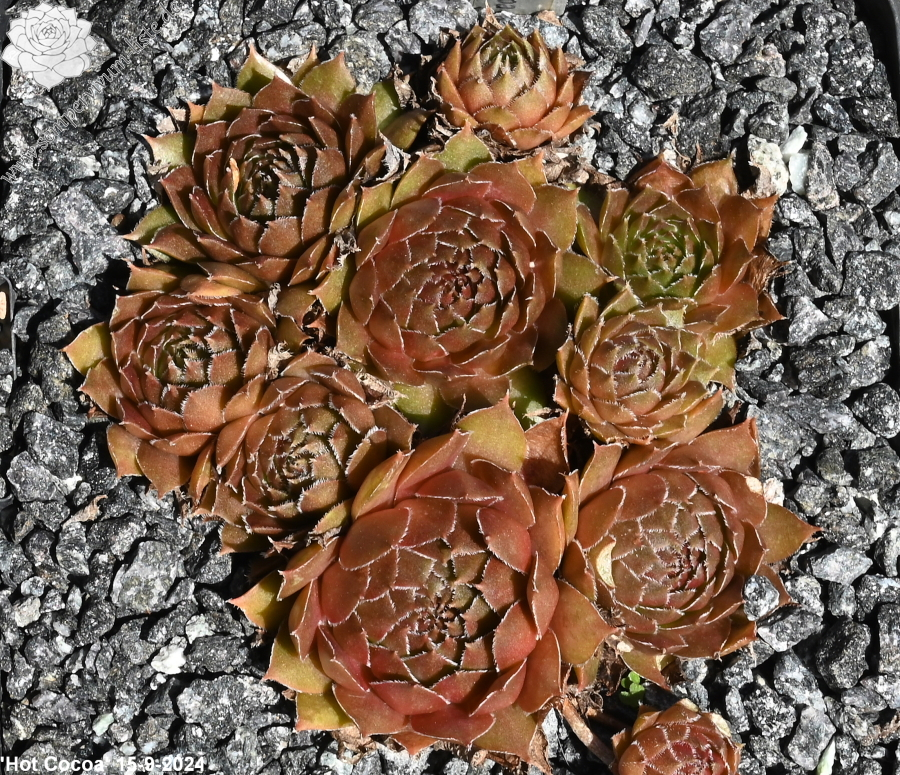 'Hot Cocoa' has medium sized, brown tinted rosettes to 4” across. The color has been relatively stable in all seasons in our garden. 'Hot Cocoa' is our seed grown selection.