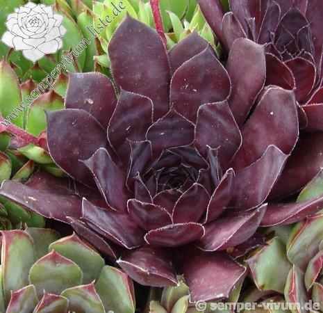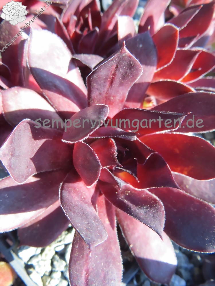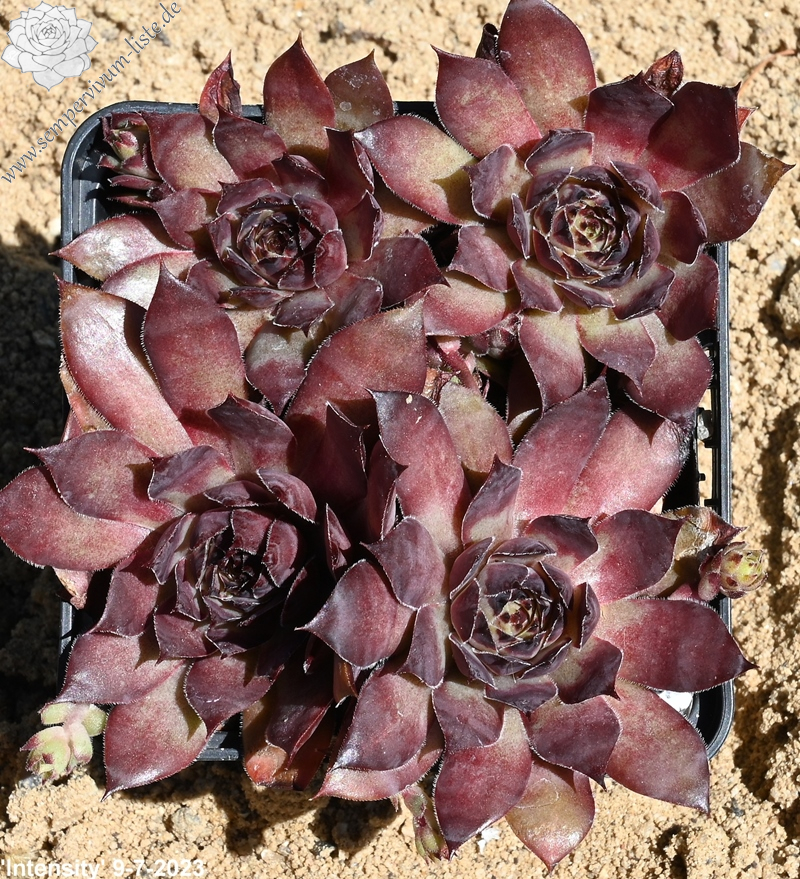Sempervivum 'Intensity' ist eine mittelgroße, sehr dunkle Sorte. Die dunkle, fast einheitliche Färbung bleibt fast das ganze Jahr sehr gut erhalten. Eine gut sprossende Pflanze, die schöne Polster bildet.