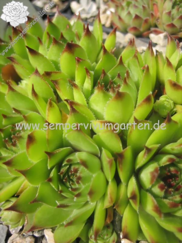 Mittelgroße Rosetten, mit kleinen roten Blattspitzen! Die dichten Polster wirken fast igelförmig!