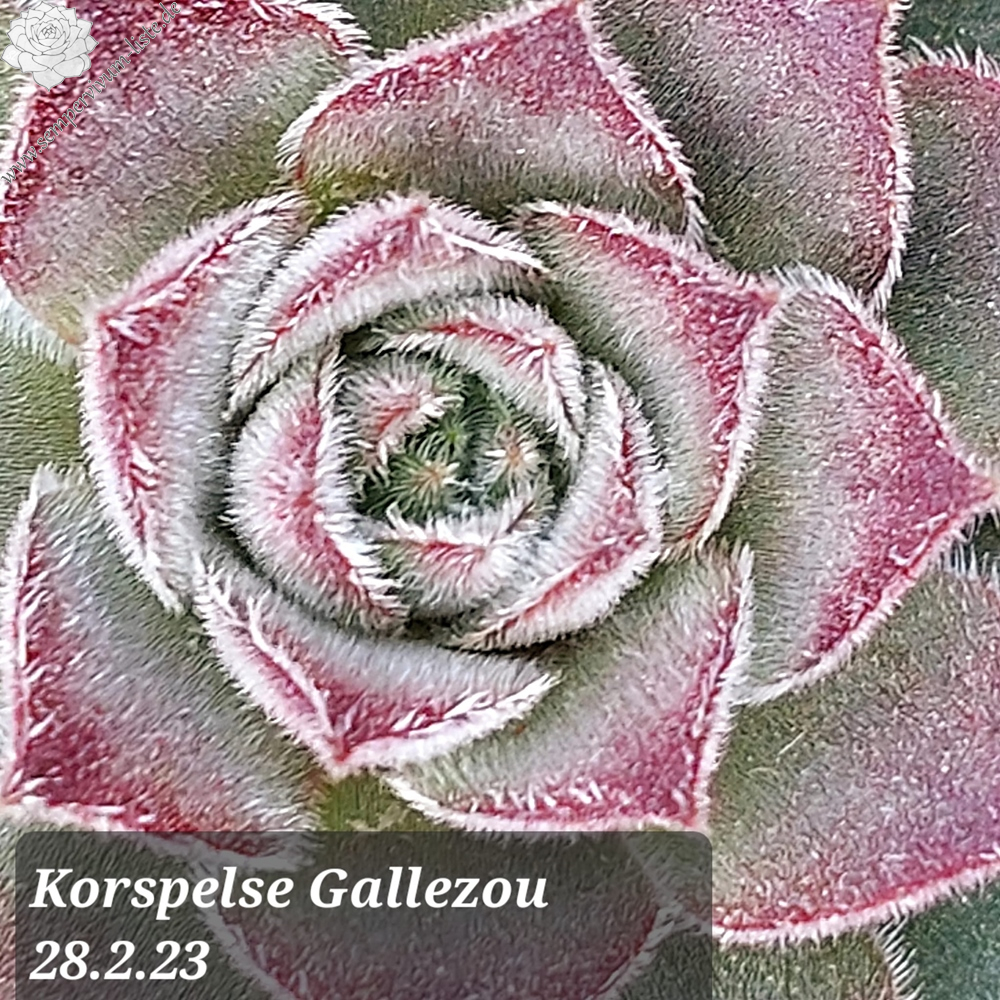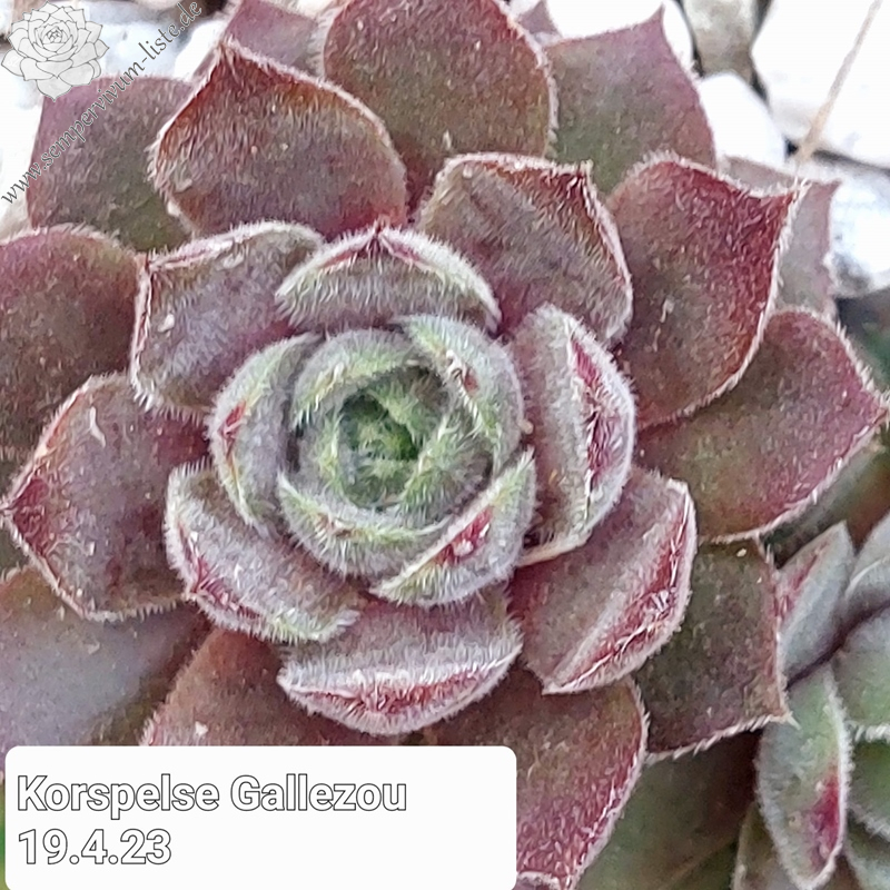 Sempervivum 'Korspelse Gallezon' ist eine neuere Züchtung von André Smits. Die mittelgroßen Rosetten sprossen nur schwach und zeigen eine kühle Färbung. Sie ist noch ganz selten in den Sammlungen vertreten!