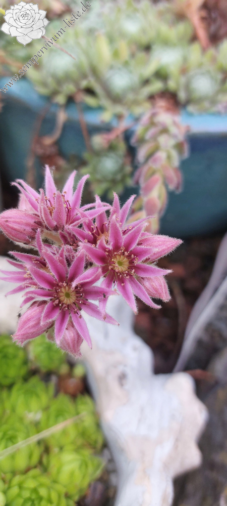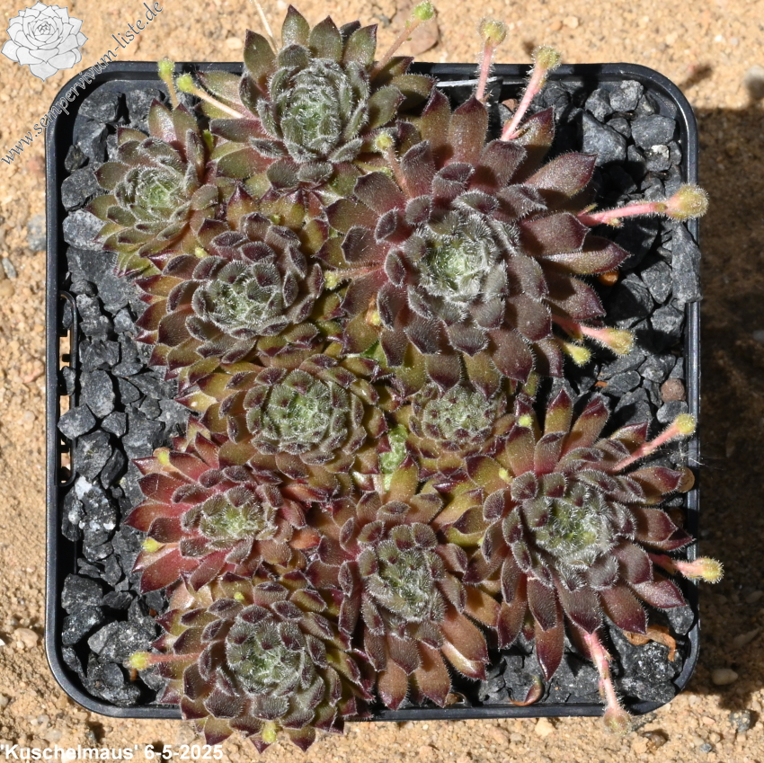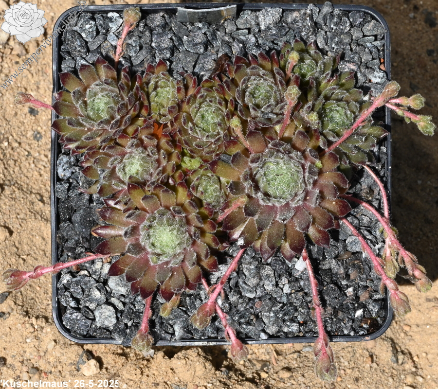 Unsere neue Auslese formt kompakte, dichte Polster mit kleinen, mit Plüsch überzogenen Rosetten. Das Laub ist auffallend dicht bewimpert und behaart. Diese vielen Härchen auf den Blättern verhelfen der Sorte in voller Sonne zu einem silbrigen Glanz. Die olivgrüne Grundfärbung ist zeitweise mit Braun und einem leicht lilafarbenen Ton vermischt. Es ist ein Sämling von 'Lloyd Praeger' - ein Kultivar der Steirischen Berghauswurz S. montanum ssp. stiriacum, der schon in den 50er Jahren in den ersten Hauswurz Sammlungen verbreitet war. Die dunklen Blattspitzen wurden Sempervivum 'Kuschelmaus' von der Mutter vererbt. Anscheinend sind durch den Vater auch Gene von der Art S. ciliosum beteiligt, denn der Anblick der Sorte lässt an diese Spezies erinnern.