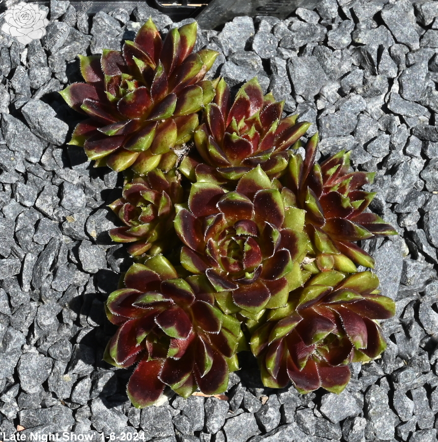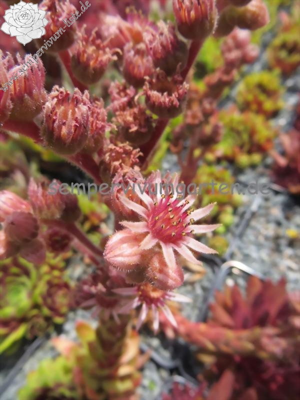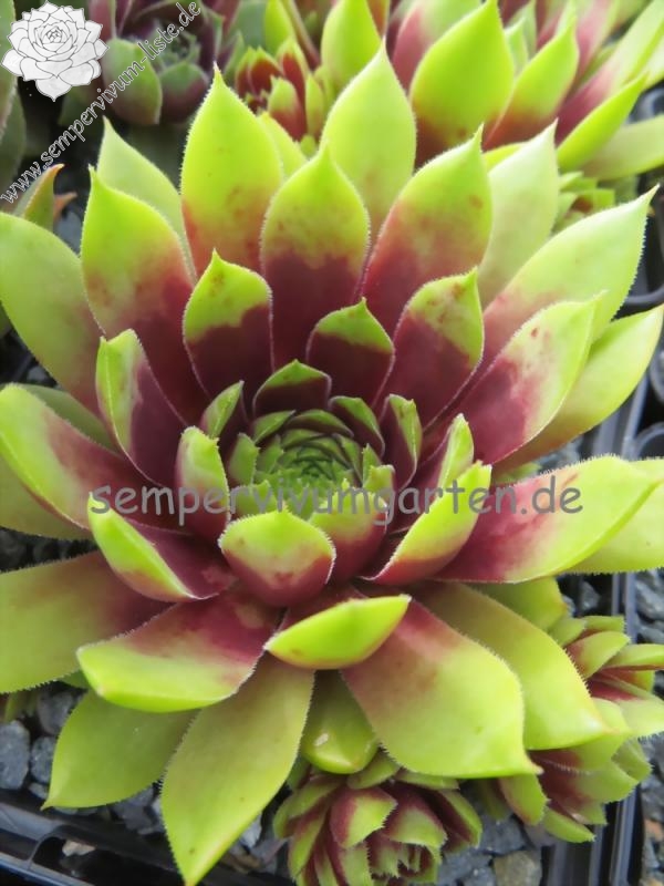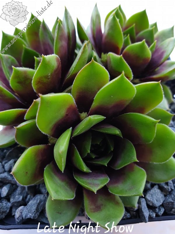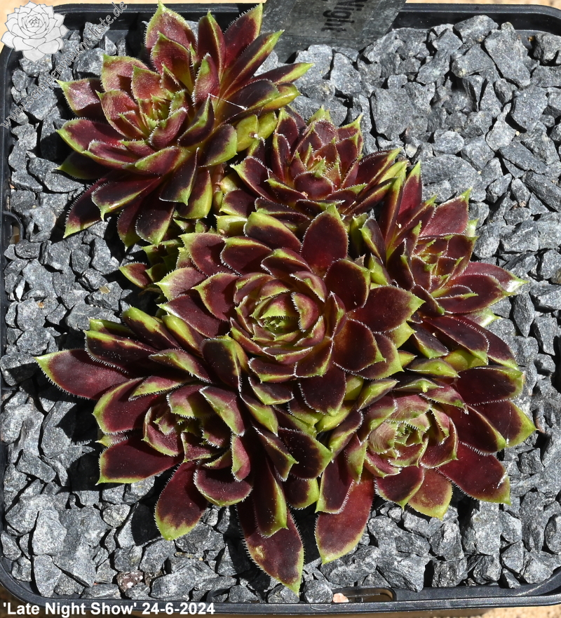 Sempervivum 'Late Night Show' ist ein größerer Sämling von 'Pipifax'. Die Rosetten erreichen einen Durchmesser von etwa 10 cm und besitzen eine offene Wirkung. Die giftgrüne Färbung sticht immer hervor und gehört zu meinen absoluten Favoriten. Im großen Zentrum zeigt sich ein kräftiger rotlila Farbton, der sich auch bei hohen Temperaturen gut hält. Ein tolles Farbspiel! Es handelt sich um robuste Pflanzen, die gut und willig sprossen. Die mittelgroßen Blüten sind schön am Blütenstiel verteilt und werden gerne von Hummeln und Bienen besucht.