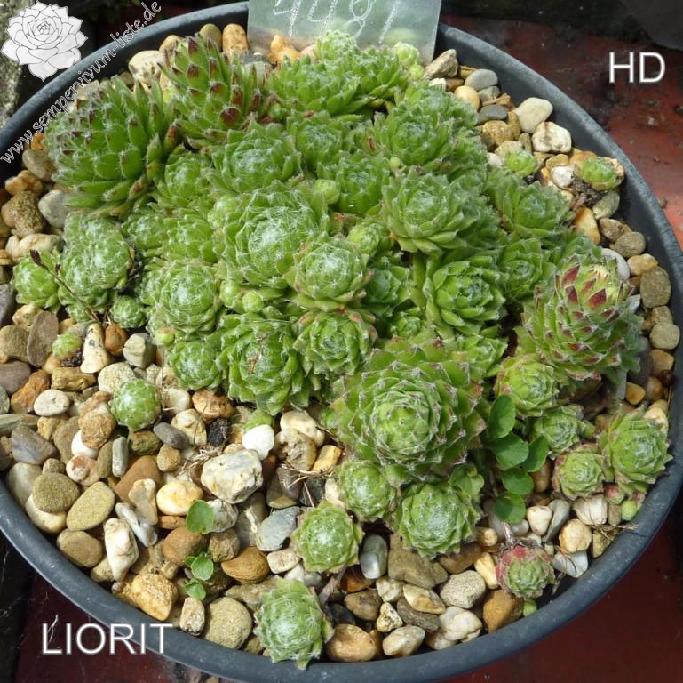 Eine neuere Hybride aus Belgien mit leuchtend grünen, weiß überwebten Rosetten, die im Verhältnis für eine Spinnwebhauswurz Züchtung etwas größer werden. S. 'Liorit' ist gut wüchsig und formt kompakte Polster. Die Blüten besitzen auffallend breite Petalen (Blütenblätter) in Rosarot.