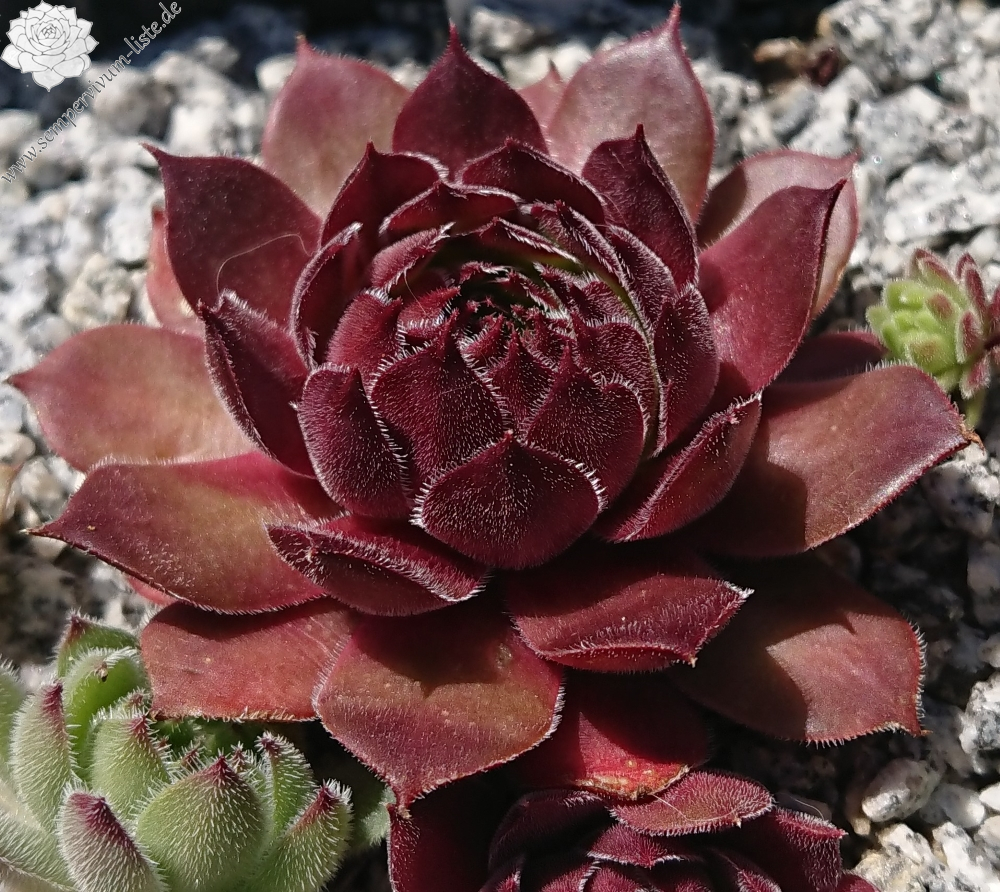kompakte, flache Rosetten, 5 - 6 cm, olivgrün, rote Flecken auf der Rückseite, von samtiger Substanz, Blüte 15 cm